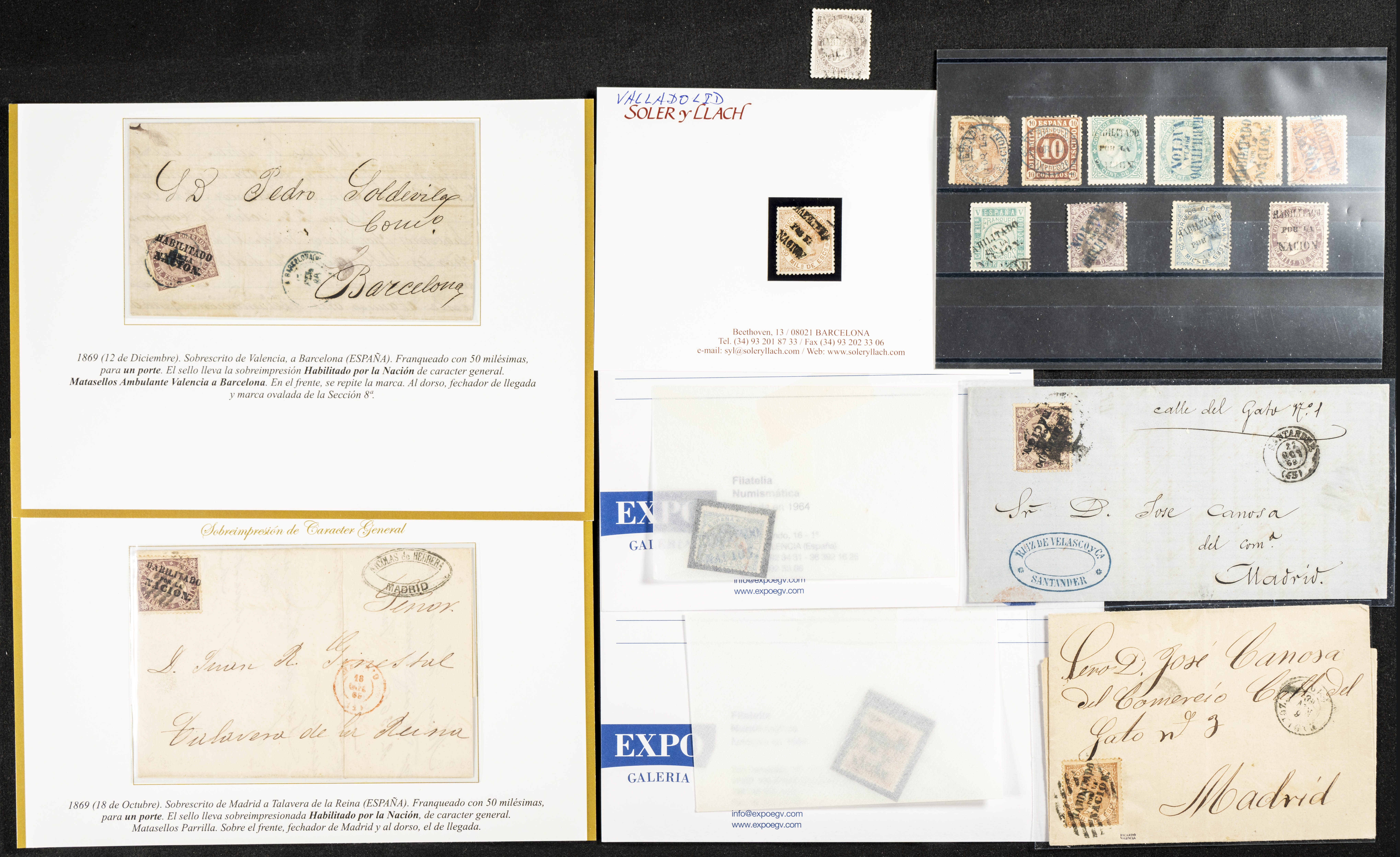(1869ca). Conjunto de sellos con sobrecargas HABILITADO POR LA NACION de diversas emisiones, nuevos y usados e incluyendo cuatro cartas, tres con 50 mils violeta de 1868 y una con 50 mils castaño de 1867, con orígenes en Badajoz, Barcelona, Madrid y Santander (se incluyen fotocopias de algún certificado de Graus o Comex). A EXAMINAR.