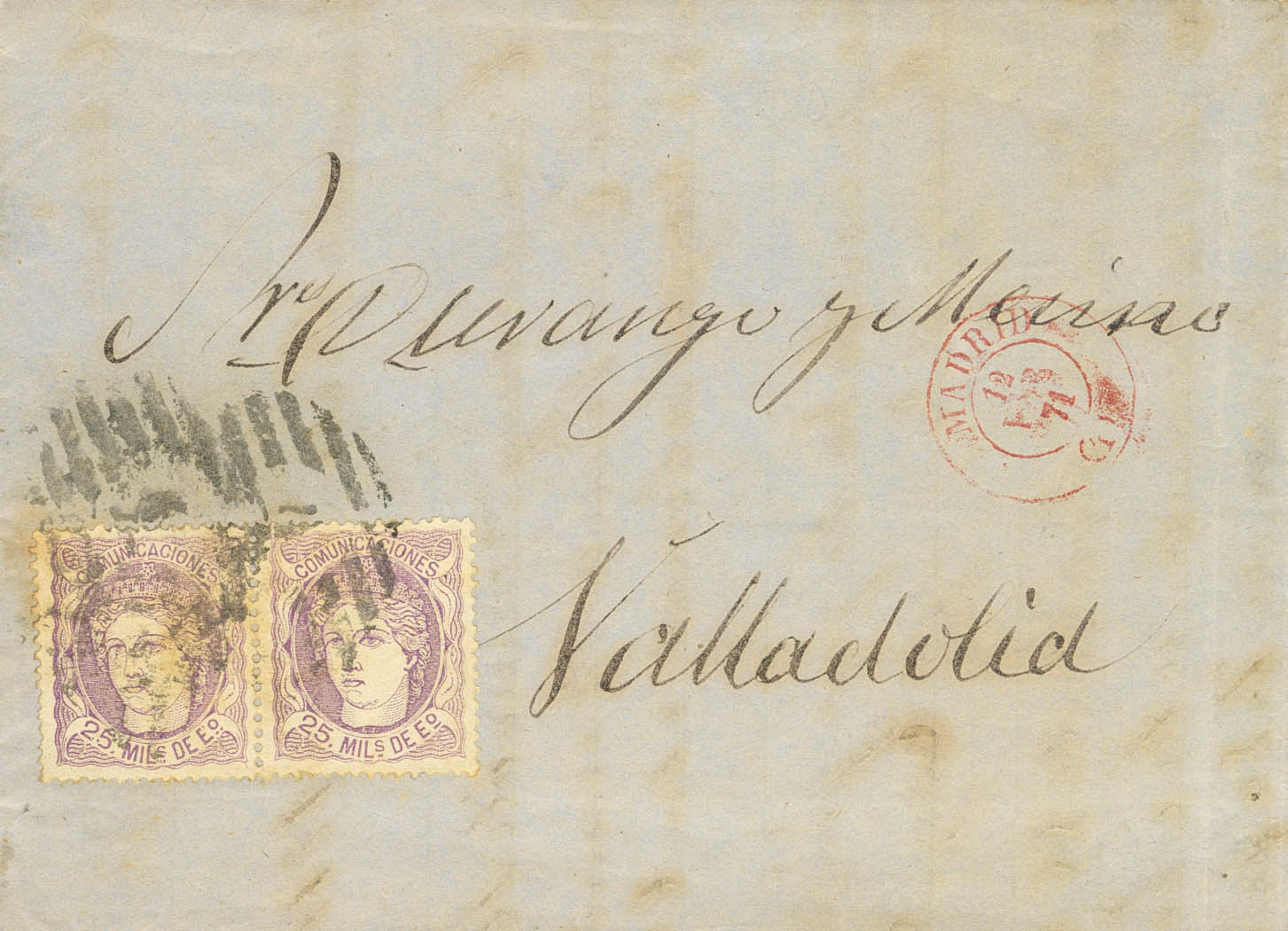 106(2). 1871. 25 mils lila, pareja. MADRID a VALLADOLID. MAGNIFICA E INUSUAL COMBINACION PARA COMPLETAR EL FRANQUEO DE PORTE SENCILLO DE 50 MILS.