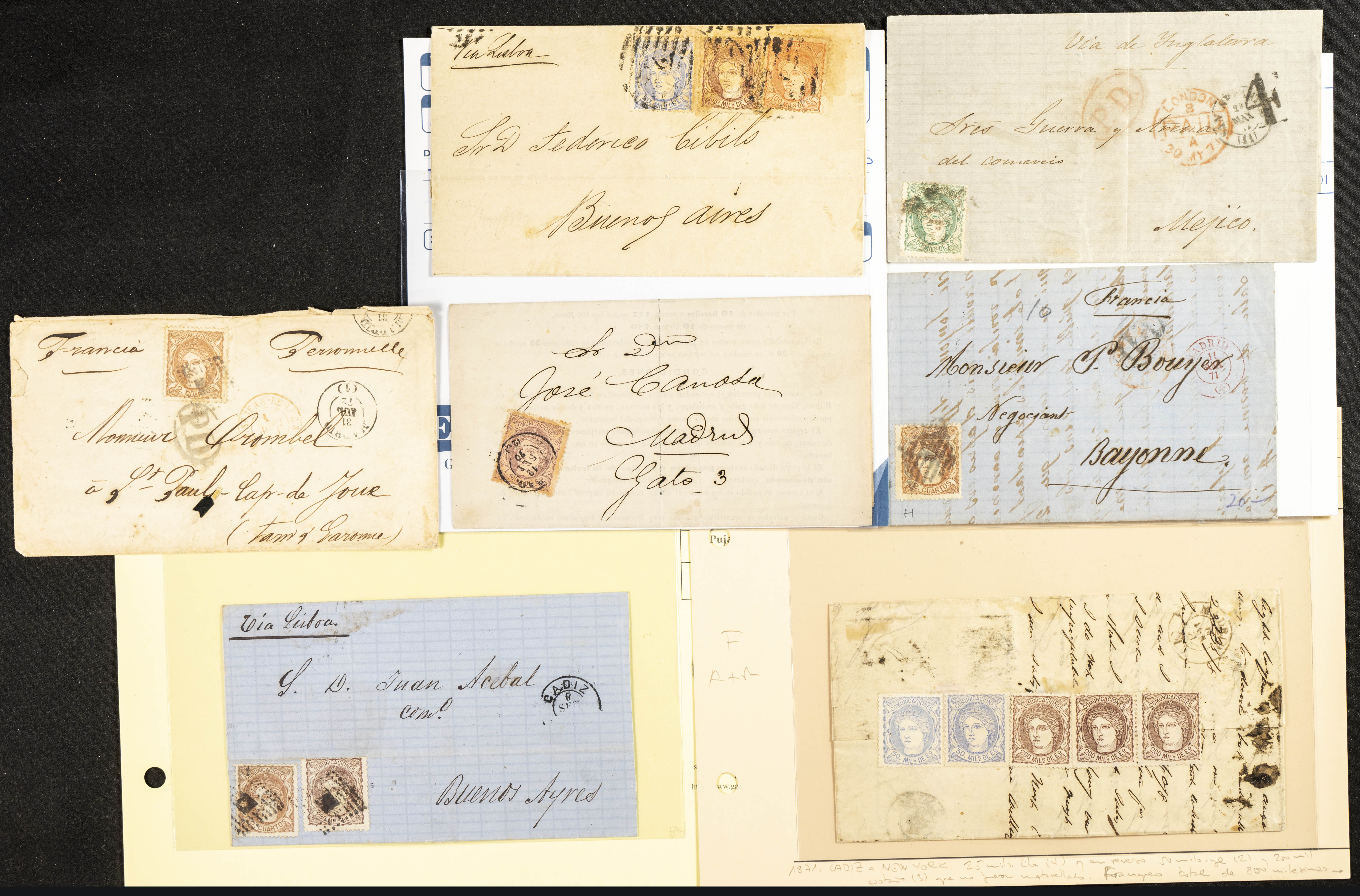 (1870ca). Conjunto de siete cartas circuladas a diversos destinos franqueadas con sellos de la emisión de Matrona de 1870, dos dirigidas a Francia, dos dirigidas a Buenos Aires, una a México (con 400 mils), otra a Nueva York con un franqueo rarísimo pero que ponemos en duda y una de Impresos (1 mis) a Madrid (algunos montados en fichas de subastas). A EXAMINAR.