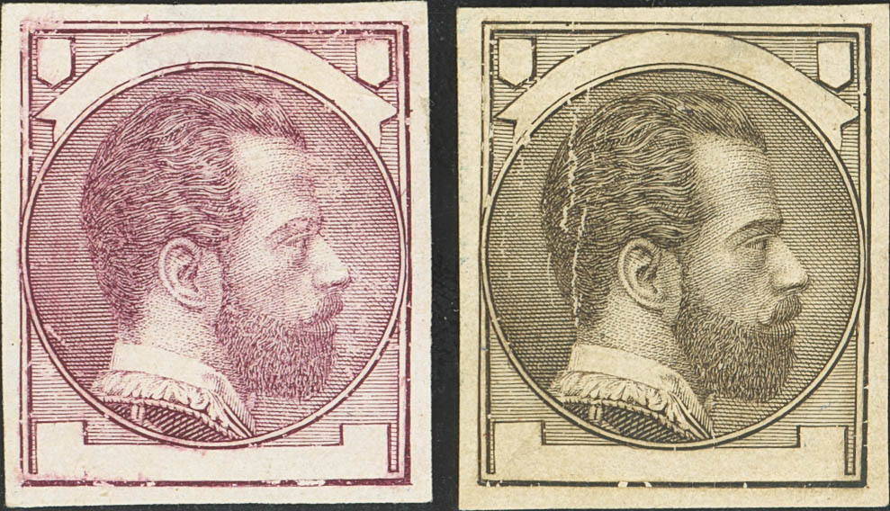 (★)1872. Sin valor y sin leyenda en lila y castaño. PRUEBAS DE PUNZON DE UN DISEÑO NO ADOPTADO. MAGNIFICAS. (Gálvez 661, 664)