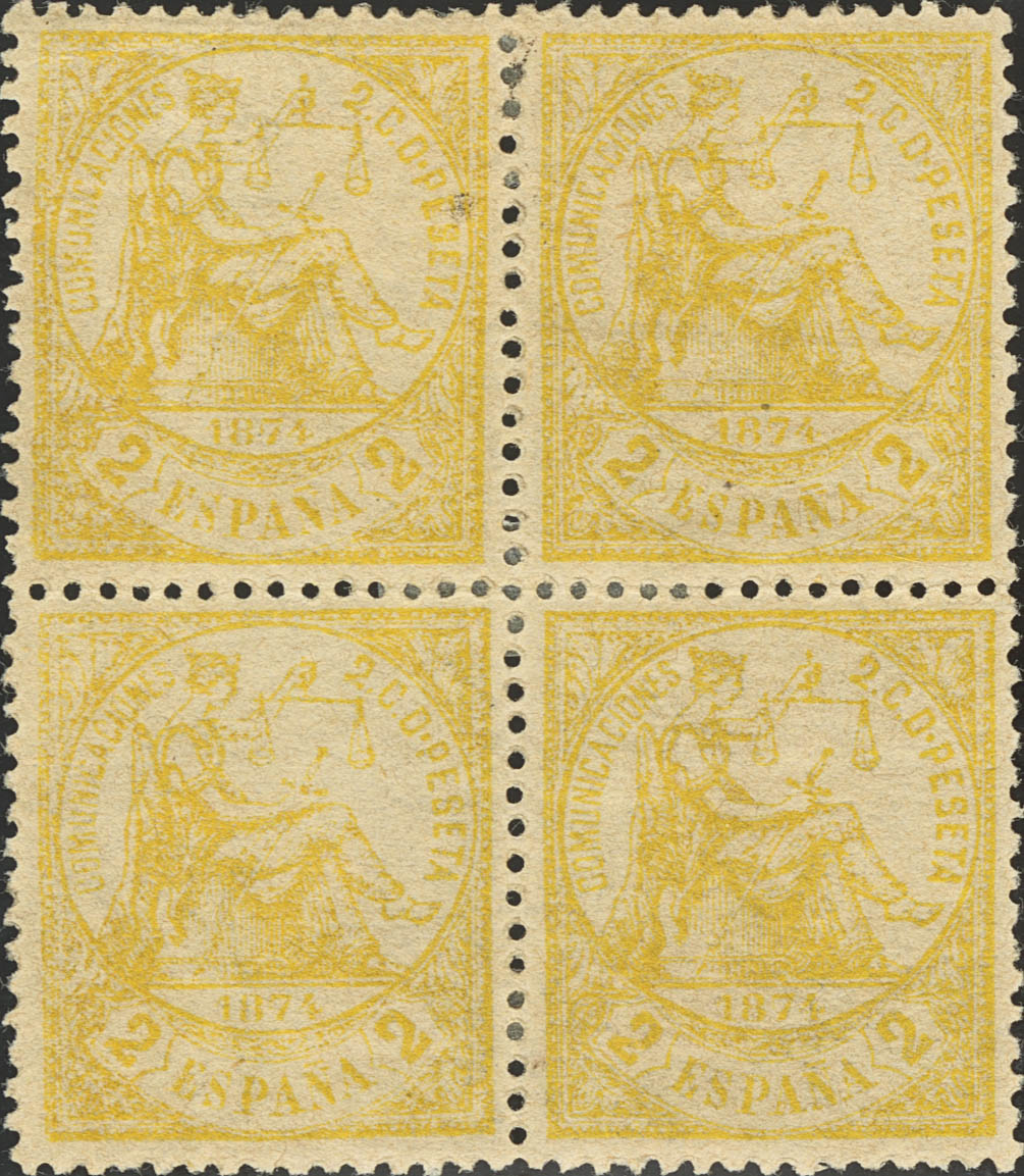 ★ 143(4). 1874. 2 cts amarillo, bloque de cuatro. Excelente centraje. MAGNIFICO.