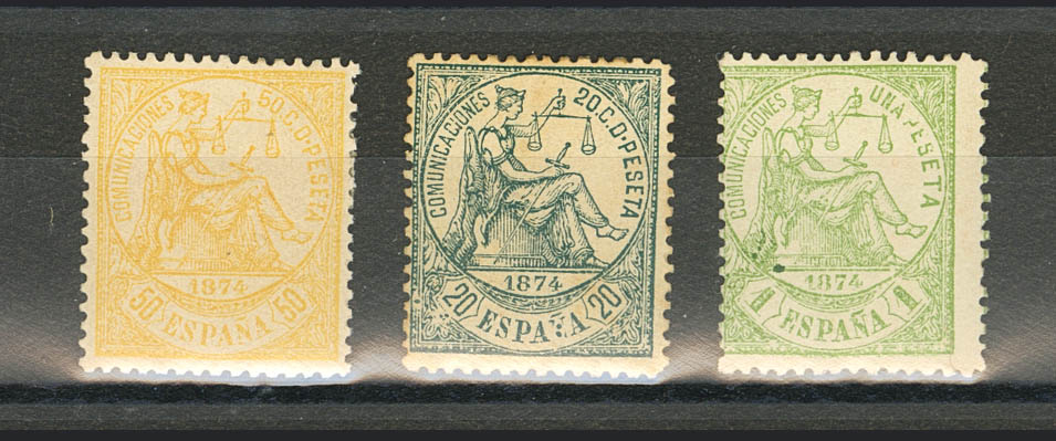 (★) 146p, 149p, 150p. 1874. 20 cts verde, 50 cts amarillo y 1 pts verde. PAPEL CARTON. BONITOS Y RAROS. Edifil 2020: 500 Euros