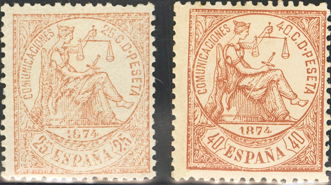 ★ 147pec, 148pec. 1874. 25 cts lila rosa y 40 cts castaño. ERROR DE COLOR y PAPEL CARTON. MAGNIFICOS. Edifil 2020: 440 Euros