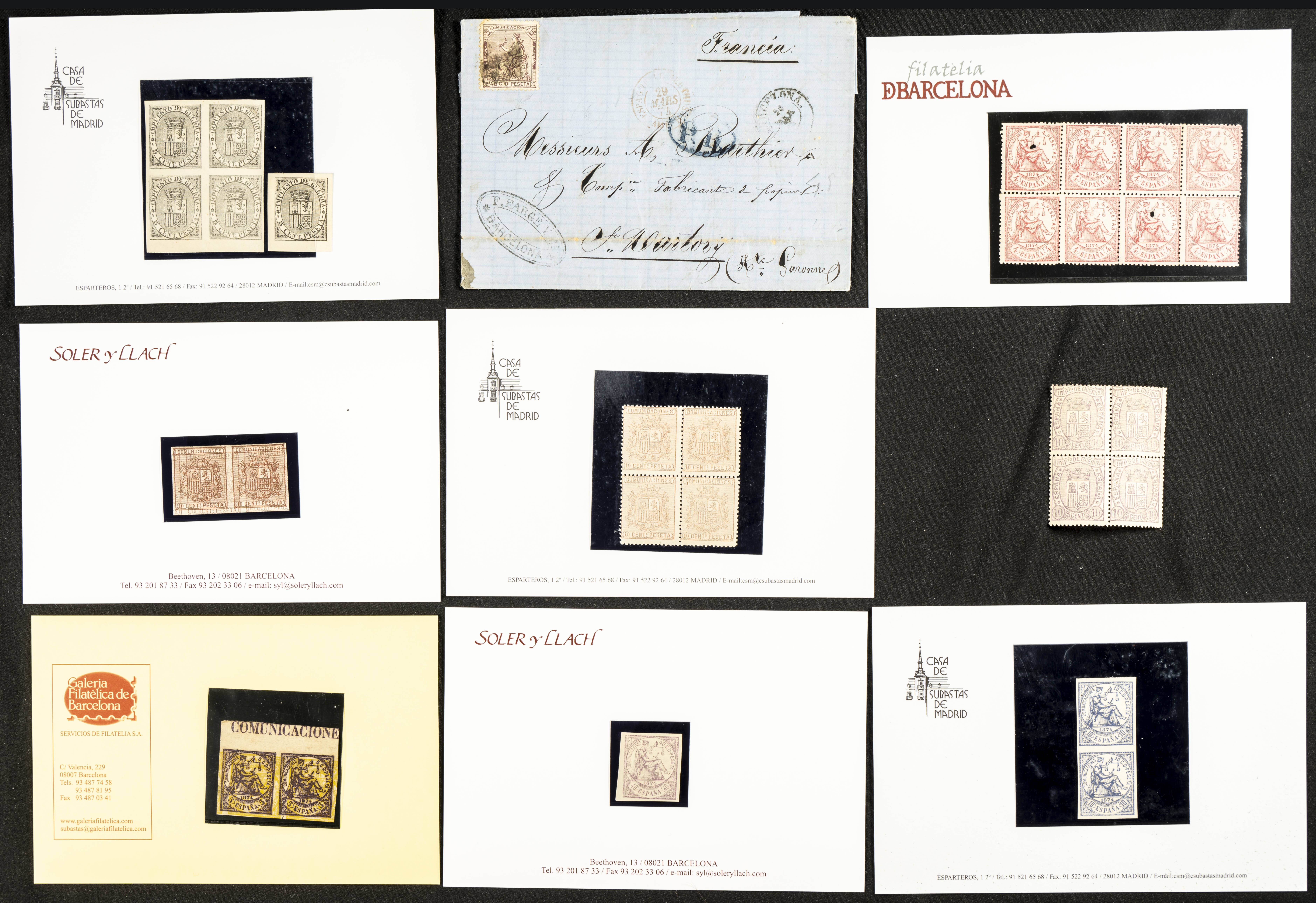 ★/(★)(1873ca). Conjunto de sellos sueltos y bloques de las emisiones de I República (1873-1875), en nuevo e incluyendo dos maculaturas, una de 5 cts de 1874 y otra de 10 cts de 1874 (Escudo), 10 cts y 40 cts de Justicia de 1874 sin dentar y una carta dirigida a Francia con el 40 cts de 1873 (algunos montados en fichas de subastas). A EXAMINAR.