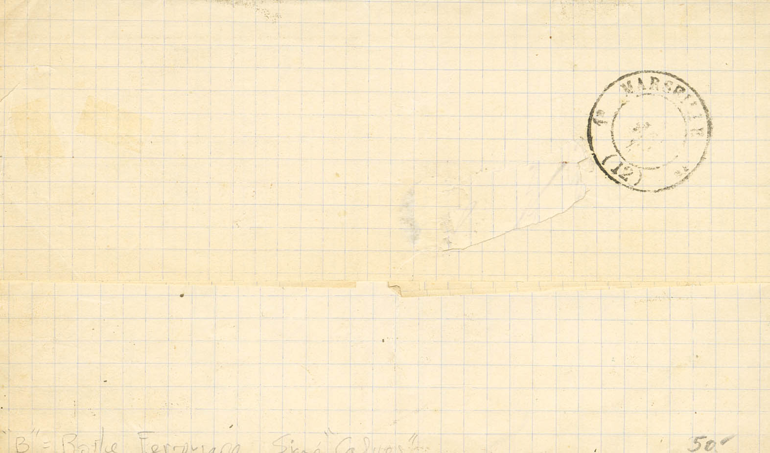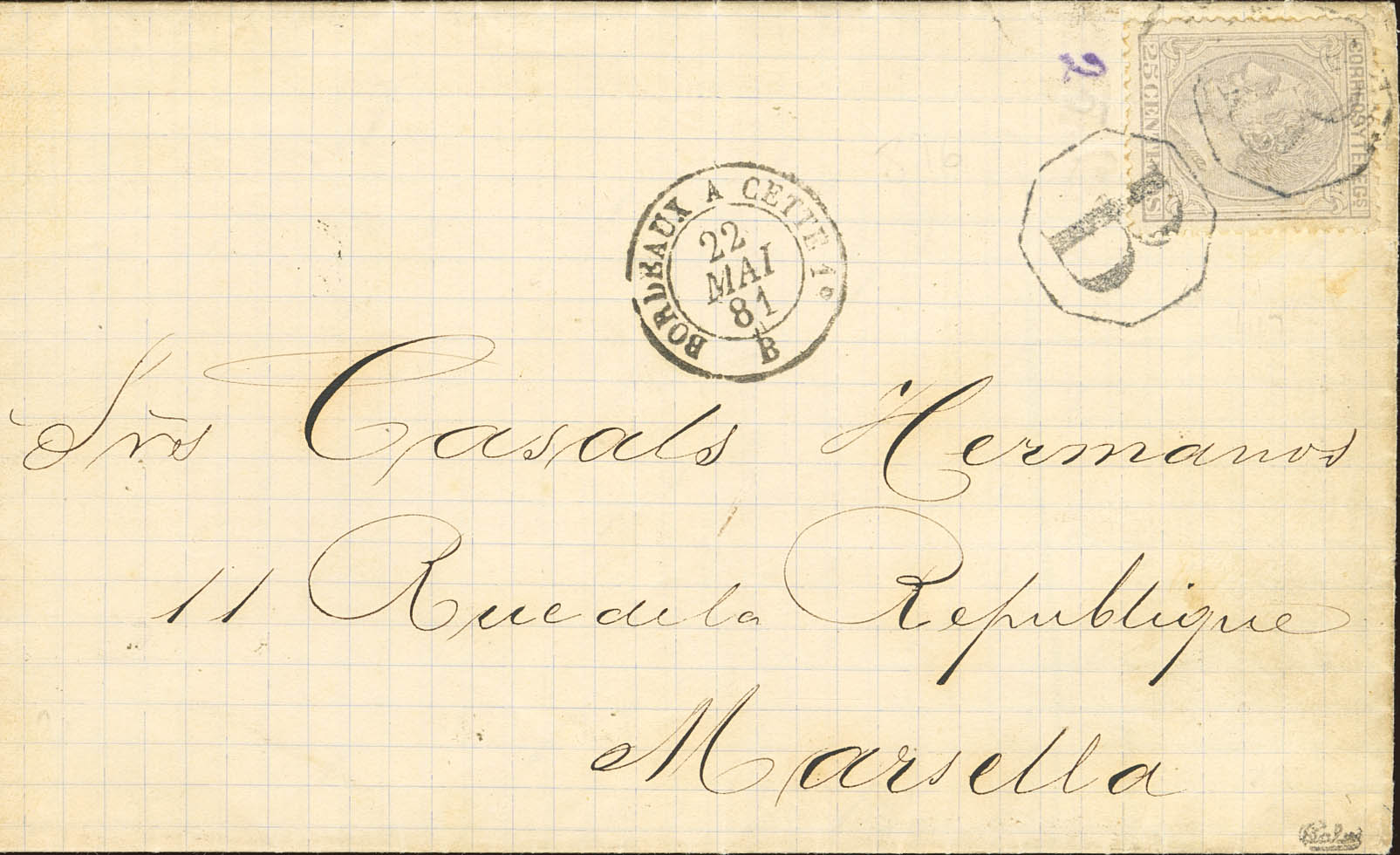 204. 1881. 25 cts gris azul. TARRAGONA a MARSELLA (FRANCIA). Matasello francés ferroviario octogonal "B", en negro. MAGNIFICA Y MUY RARA.