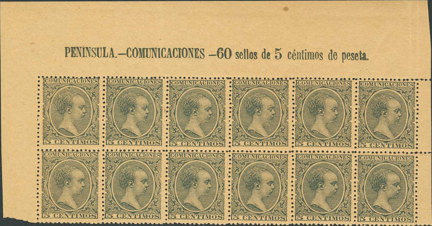 ★★ 216(12). 1889. 5 cts verde, bloque de doce, con borde de hoja. MAGNIFICO Y RARISIMO.