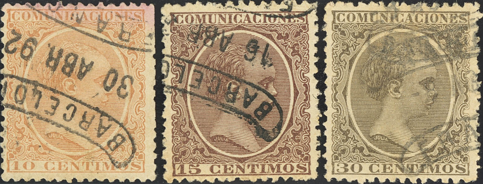 217, 219, 222. 1889. 10 cts castaño claro (dientes justos en margen derecho), 15 cts castaño lila y 30 cts verde bronce. Matasello BARCELONA / FRANCO. BONITOS.