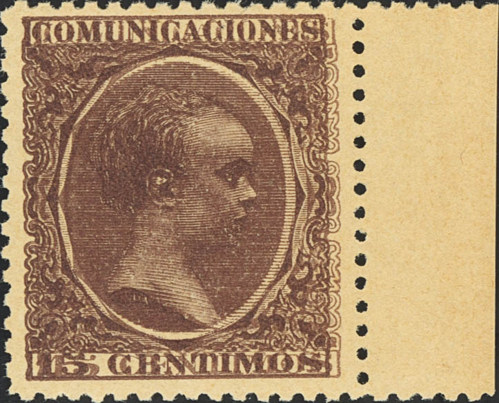 ★★ 219ed. 1889. 15 cts castaño lila, borde de hoja. DOBLE IMPRESION. MAGNIFICO. Edifil 2020: +176 Euros