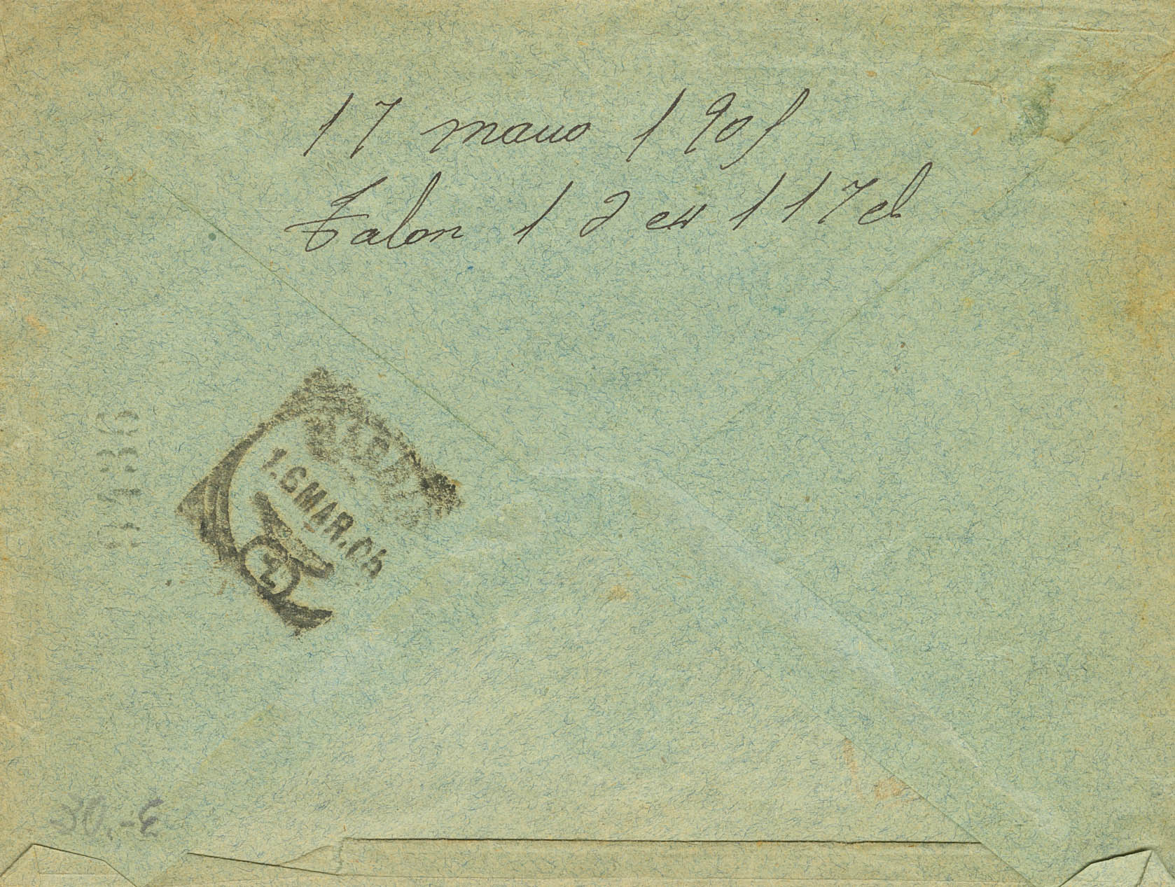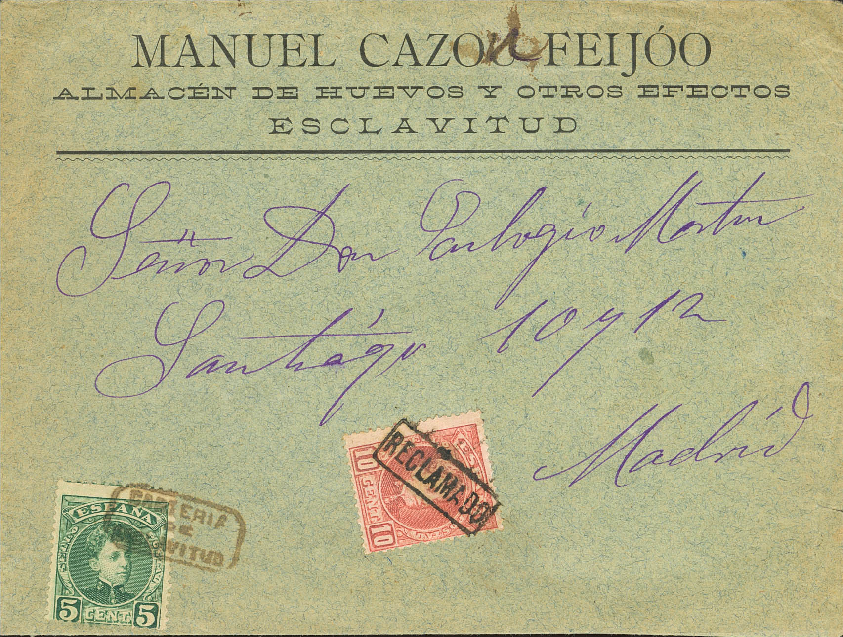 242, 243. 1905. 5 cts verde y 10 cts rojo. ESCLAVITUD (LA CORUÑA) a MADRID. Matasello CARTERIA / DE / ESCLAVITUD sobre el 5 cts y RECLAMADO sobre el 10 cts rojo, aplicado por falta de franqueo. MAGNIFICA Y RARA.