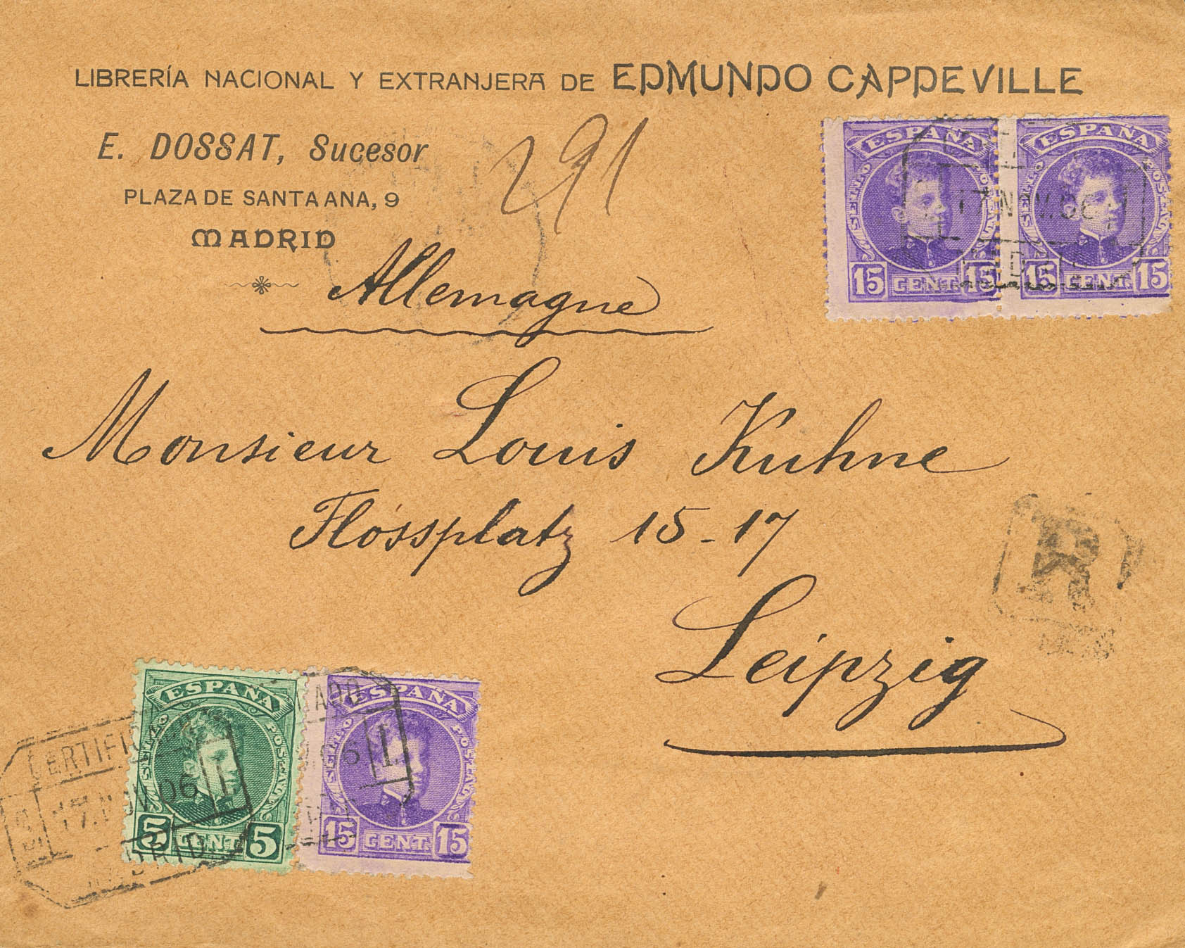 242, 246(3). 1901. 5 cts verde y 15 cts violeta, tres sellos. Certificado de MADRID a LEIPZIG (ALEMANIA). Al dorso llegada. MAGNIFICA.