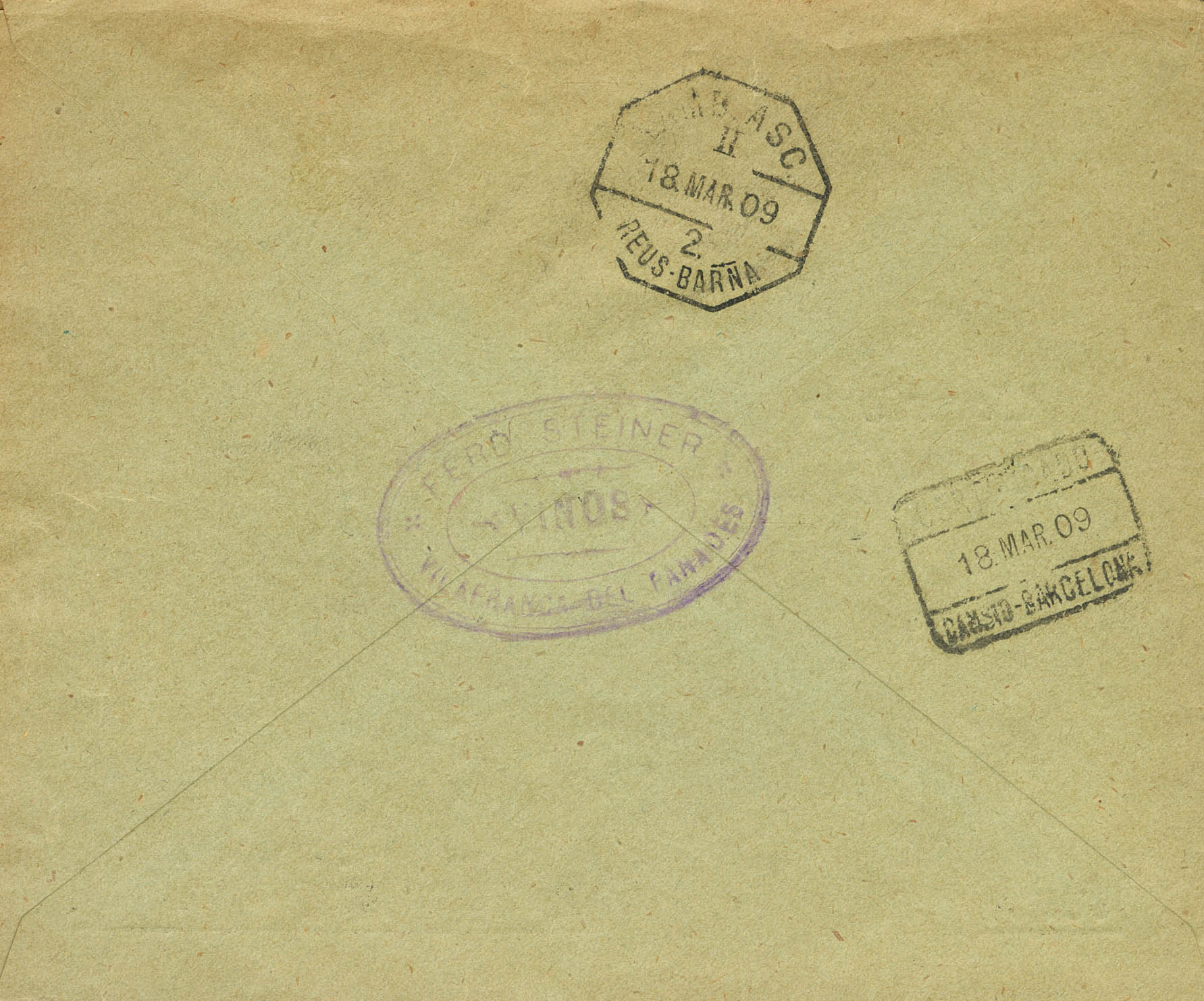 248(2). 1909. 25 cts azul, dos sellos. Certificado de VILLAFRANCA DEL PENEDES a WINTERTHUR (SUIZA). Al dorso llegada. MAGNIFICA.