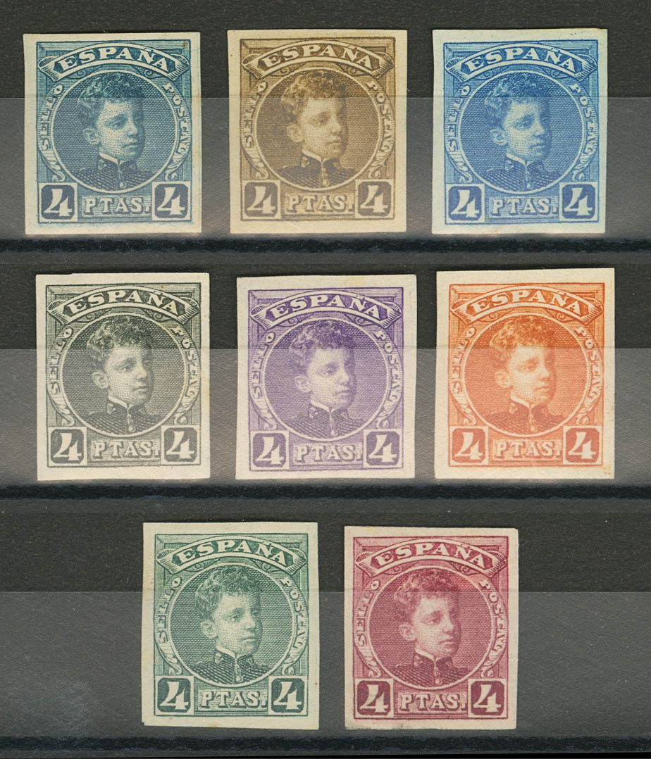 (★) 254P(8). 1901. Conjunto de ocho ENSAYOS DE COLOR y SIN DENTAR, sobre papel ordinario del 4 pts. MAGNIFICOS Y RARISIMOS. (Gálvez 1680/87)