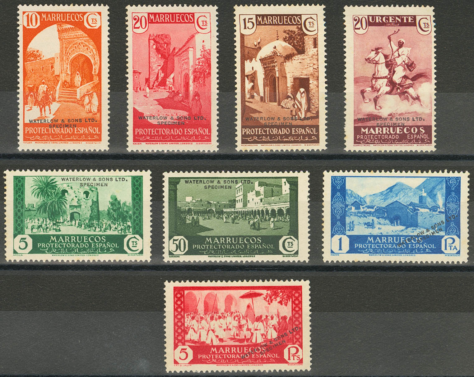 (★) 137/47Hccb. 1933. 5 cts verde, 10 cts naranja, 15 cts castaño, 20 cts rosa, 50 cts verde oscuro, 1 pts azul, 5 pts rojo y 20 cts violeta castaño. CAMBIOS DE COLOR y sobrecarga WATERLOW AND SONS LTD / SPECIMEN, sin taladro. MAGNIFICOS Y RAROS, LOS VALORES DE 5 CTS, 10 CTS Y 20 CTS NO ESTAN RESEÑADOS EN EDIFIL.