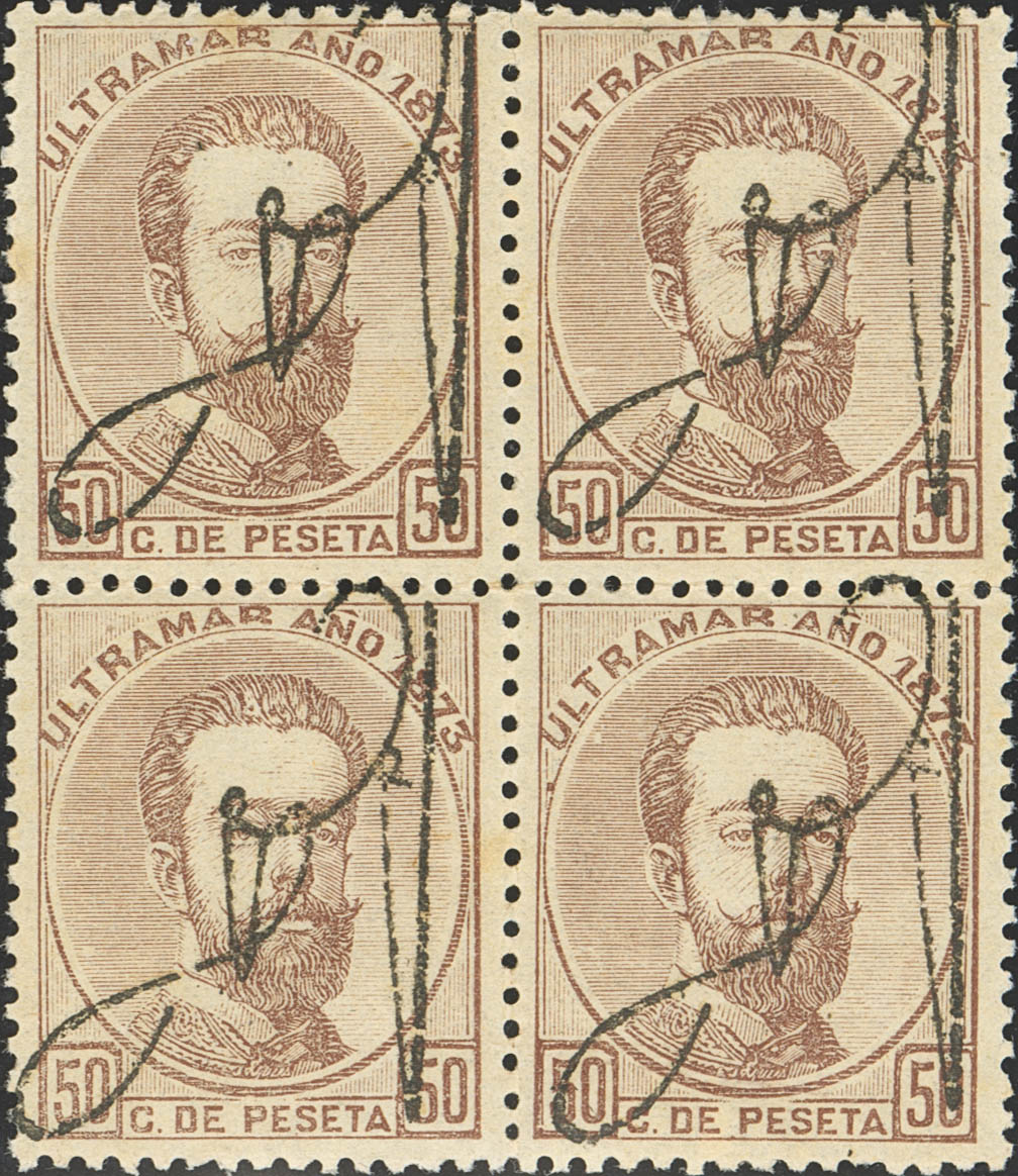 ★★/★ 2(4). 1873. 50 cts castaño, bloque de cuatro. MAGNIFICO Y MUY RARO. Edifil 2019: +1.090 Euros