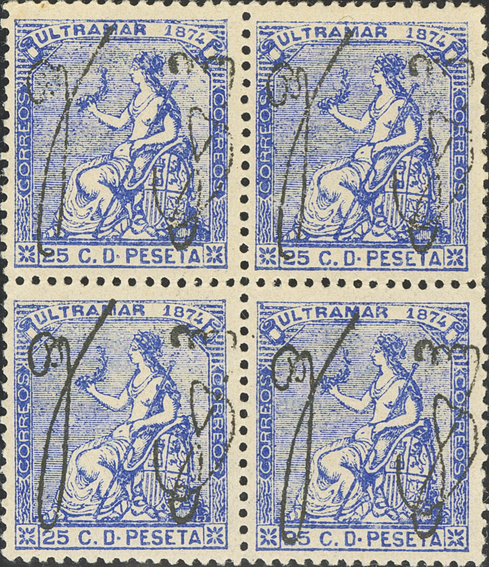 (★) 4(4). 1874. 25 cts azul, bloque de cuatro. Excelente centraje. MAGNIFICO. Edifil 2019: 440 Euros