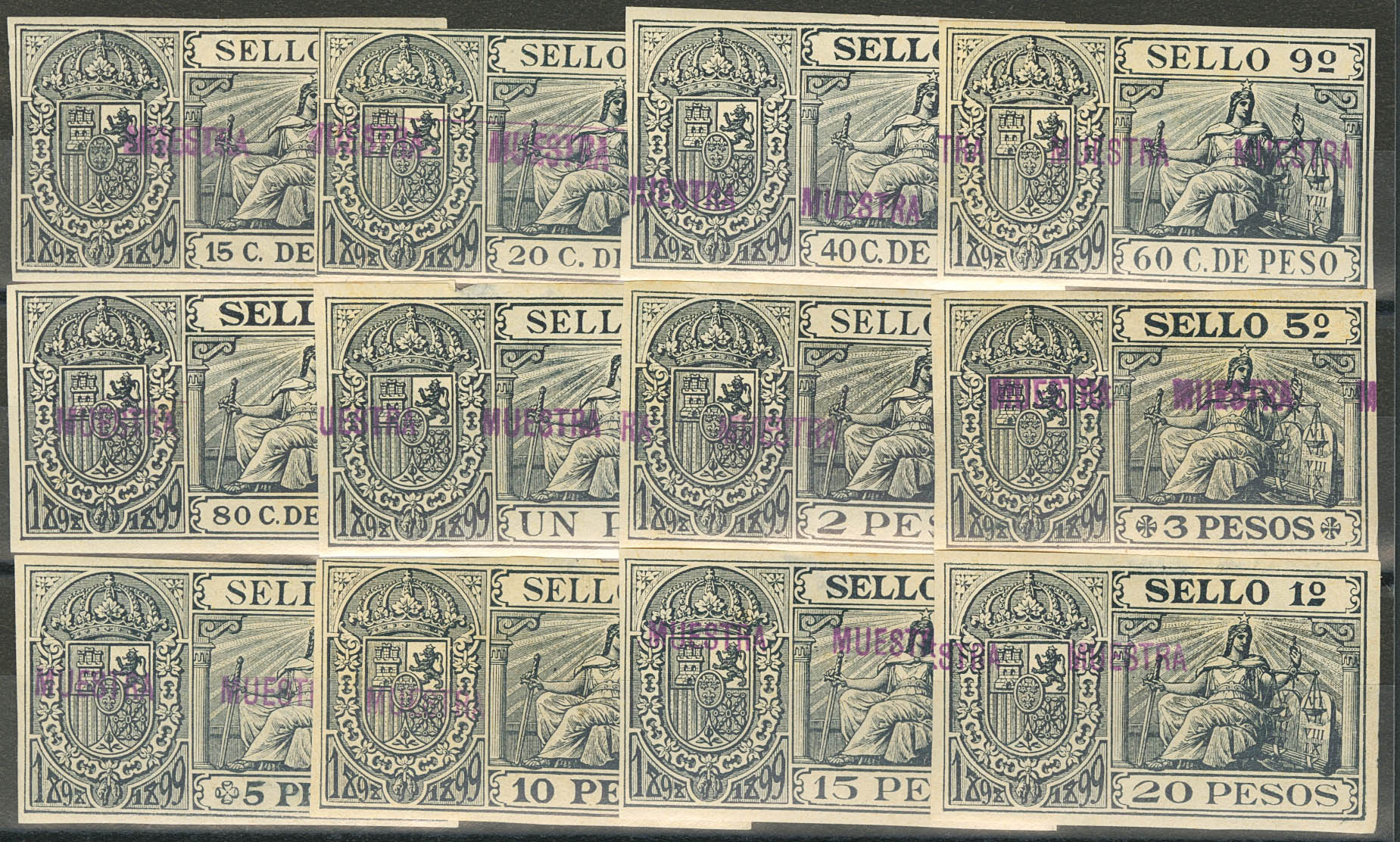 (★)1898. Serie completa ULTIMAS VOLUNTADES, doce valores. MUESTRA, en violeta. BONITA Y RARISIMA. (Forbin 1/12, Barata 85/96)