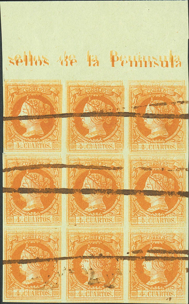 52ed(9). 1860. 4 cuartos naranja DOBLE IMPRESION, bloque de nueve, cabecera de pliego. Inutilizado con raya de tinta. MAGNIFICO. Edifil 2020: 486 Euros