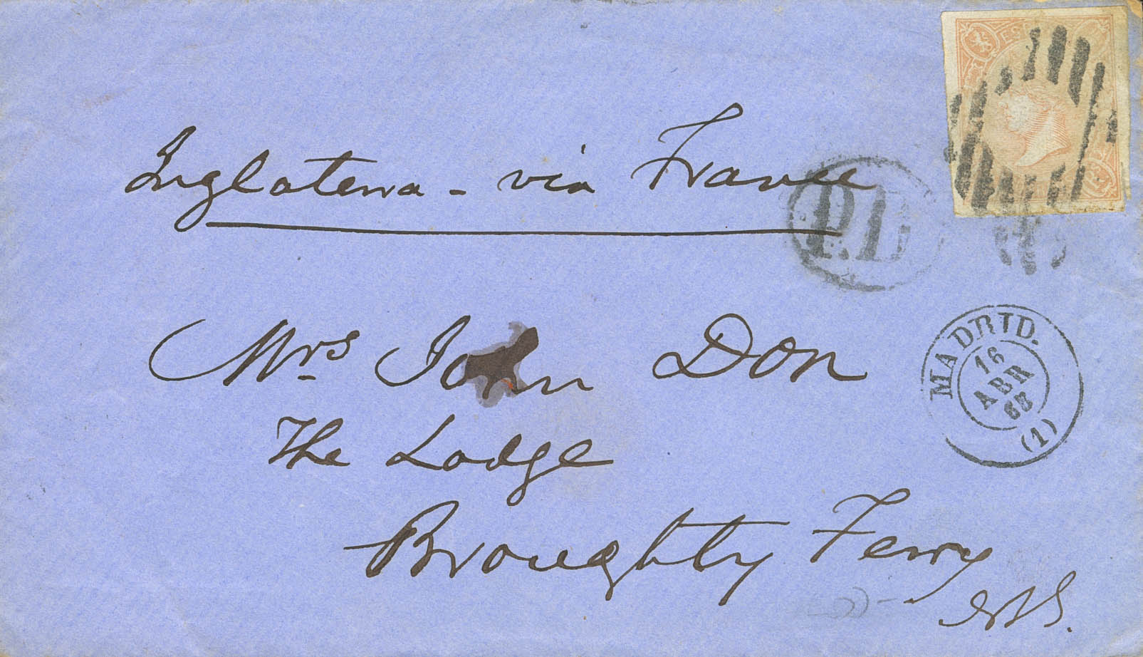 73A. 1865. 2 reales salmón. MADRID a BROUGHTY FERRY (ESCOCIA). Matasello PARRILLA (sin número). MAGNIFICA Y RARA.