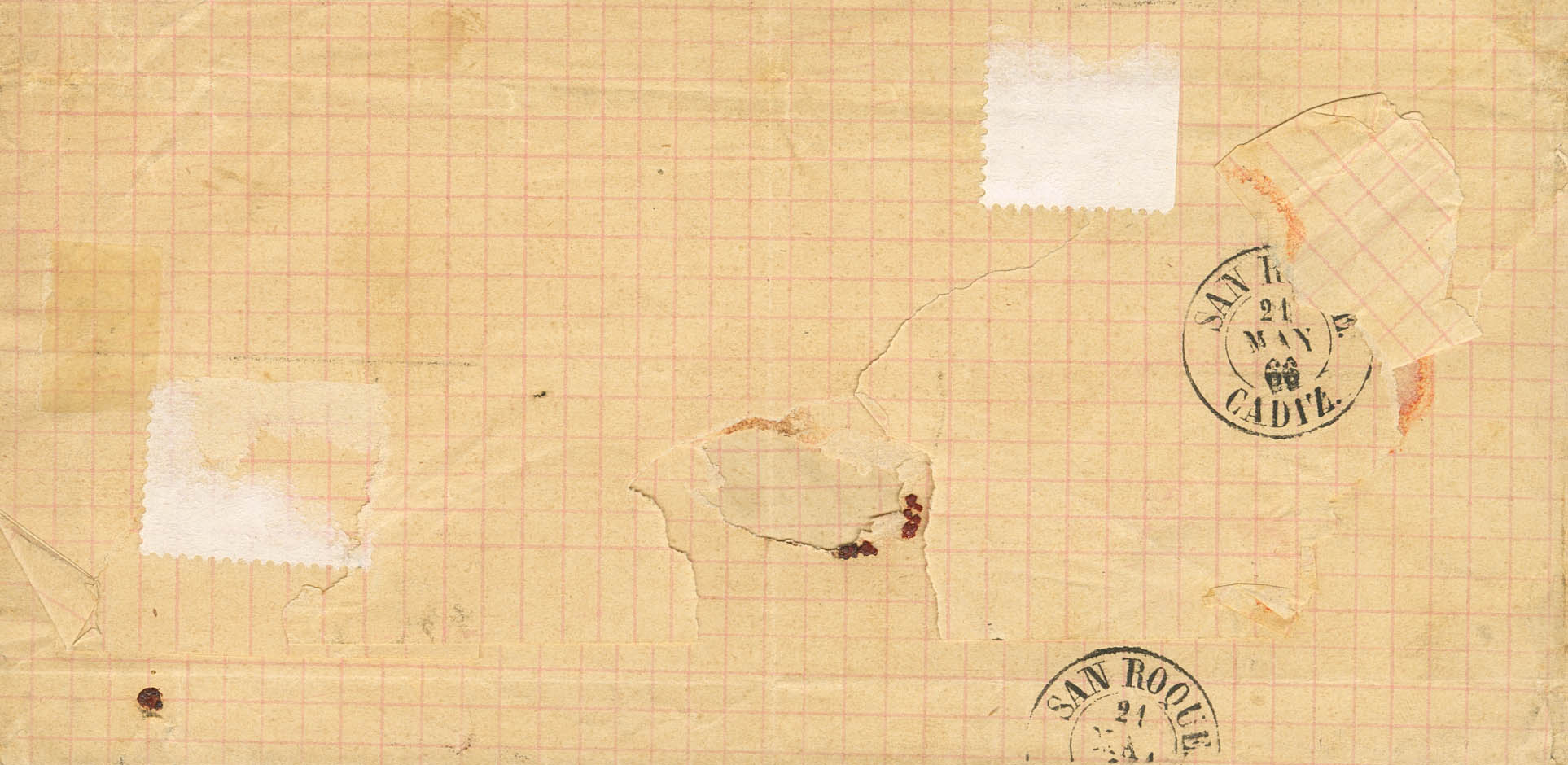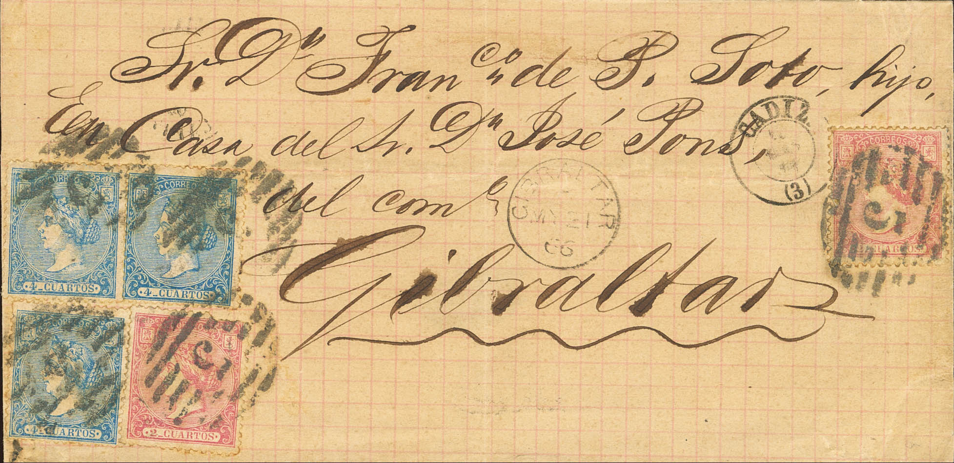 80(2), 81(3). 1866. 2 cuartos rosa, dos sellos y 4 cuartos azul, tres sellos. CADIZ a GIBRALTAR. MAGNIFICA Y ESPECTACULAR Y RARISIMA COMBINACION DE FRANQUEO PARA COMPLETAR LA TARIFA DE CUATRO PORTES A GIBRALTAR.