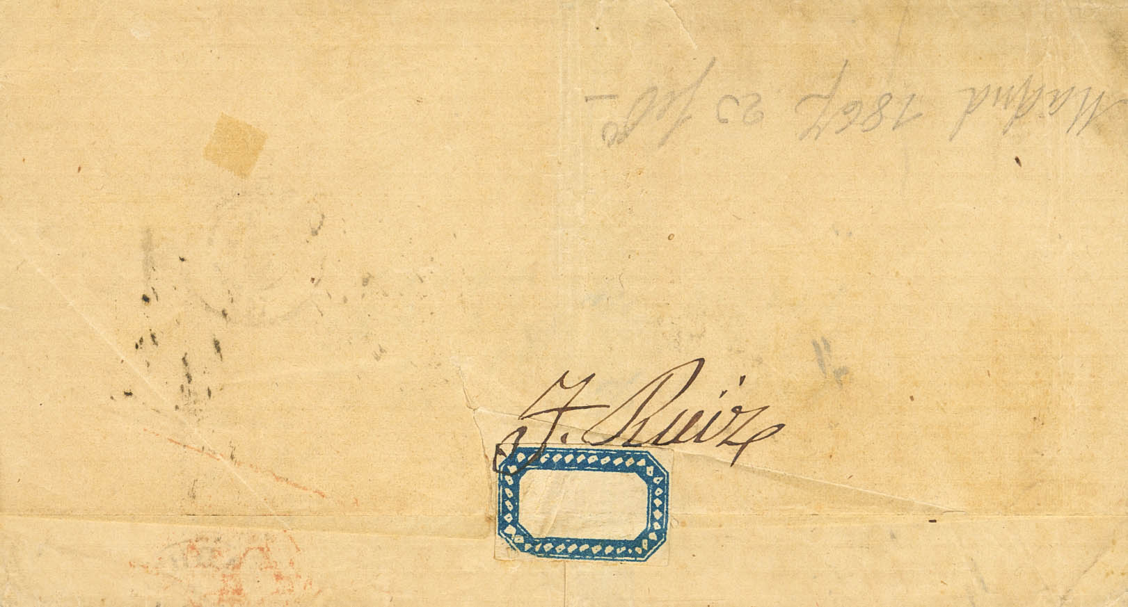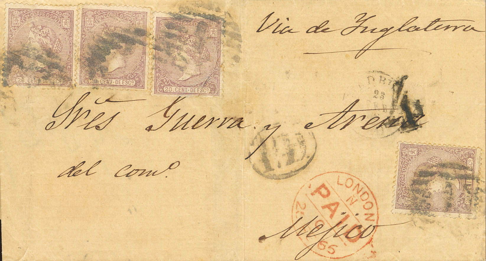 85(4). 1866. 20 cts violeta, cuatro sellos. MADRID a MEJICO. MAGNIFICA Y RARO DOBLE PORTE, ESPECTACULAR.