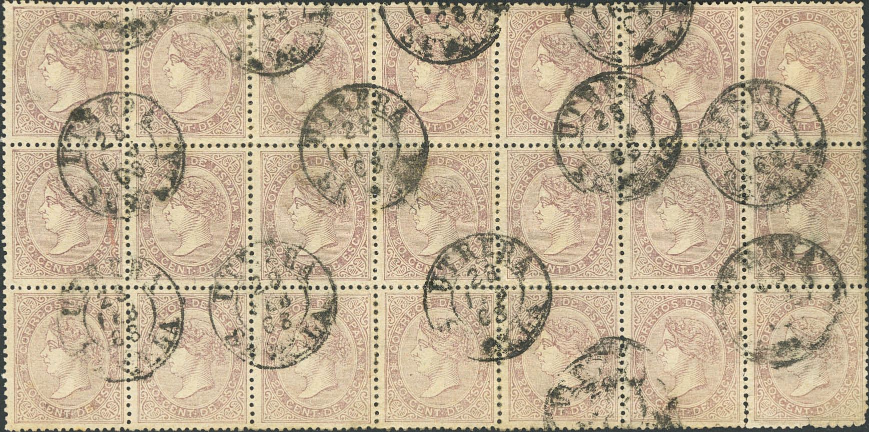 92(21). 1868. 20 cts lila, bloque de veintiún (algún defecto sin ninguna importancia). Matasello UTRERA / SEVILLA (Tipo I). MAGNIFICO Y ESPECTACULAR.