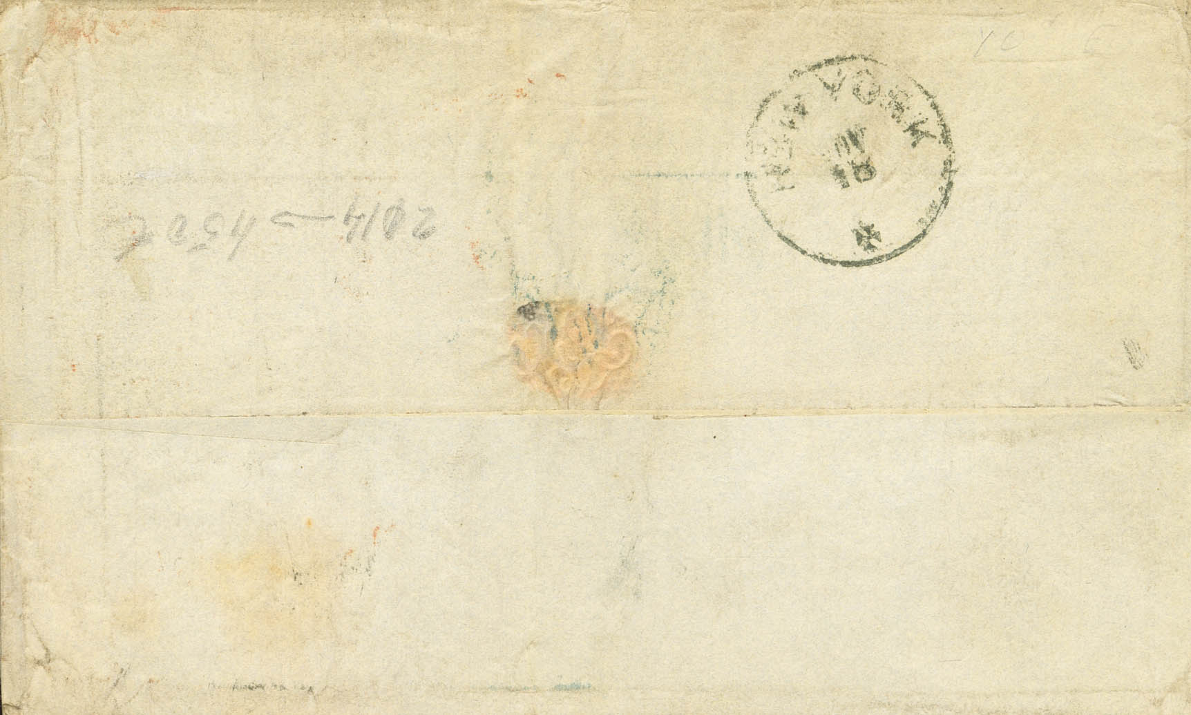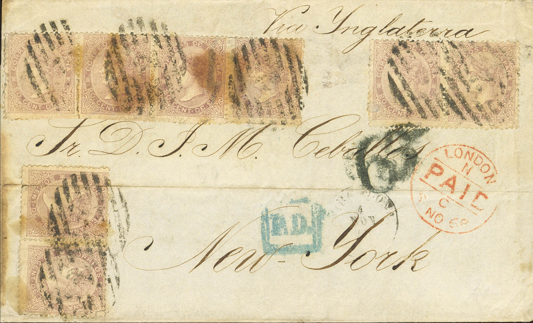 92(8). 1868. 20 cts lila, ocho sellos (doblez de archivo y conservación habitual). BARCELONA a NUEVA YORK. MAGNIFICO Y RARISIMO CUADRUPLE PORTE.