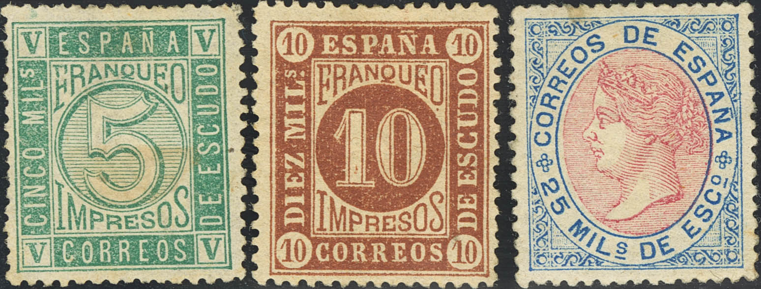 ★/(★) 93, 94, 95. 1867. 5 mils verde, 10 mils castaño y 25 mils azul y rosa (calidades diversas). MAGNIFICOS.