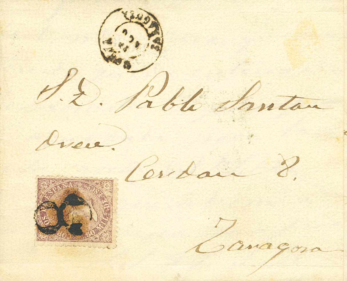 98. 1869. 50 mils violeta. BORJA (ZARAGOZA) a ZARAGOZA. Matasello de porteo "8", en negro de Borja. MAGNIFICA Y RARA.