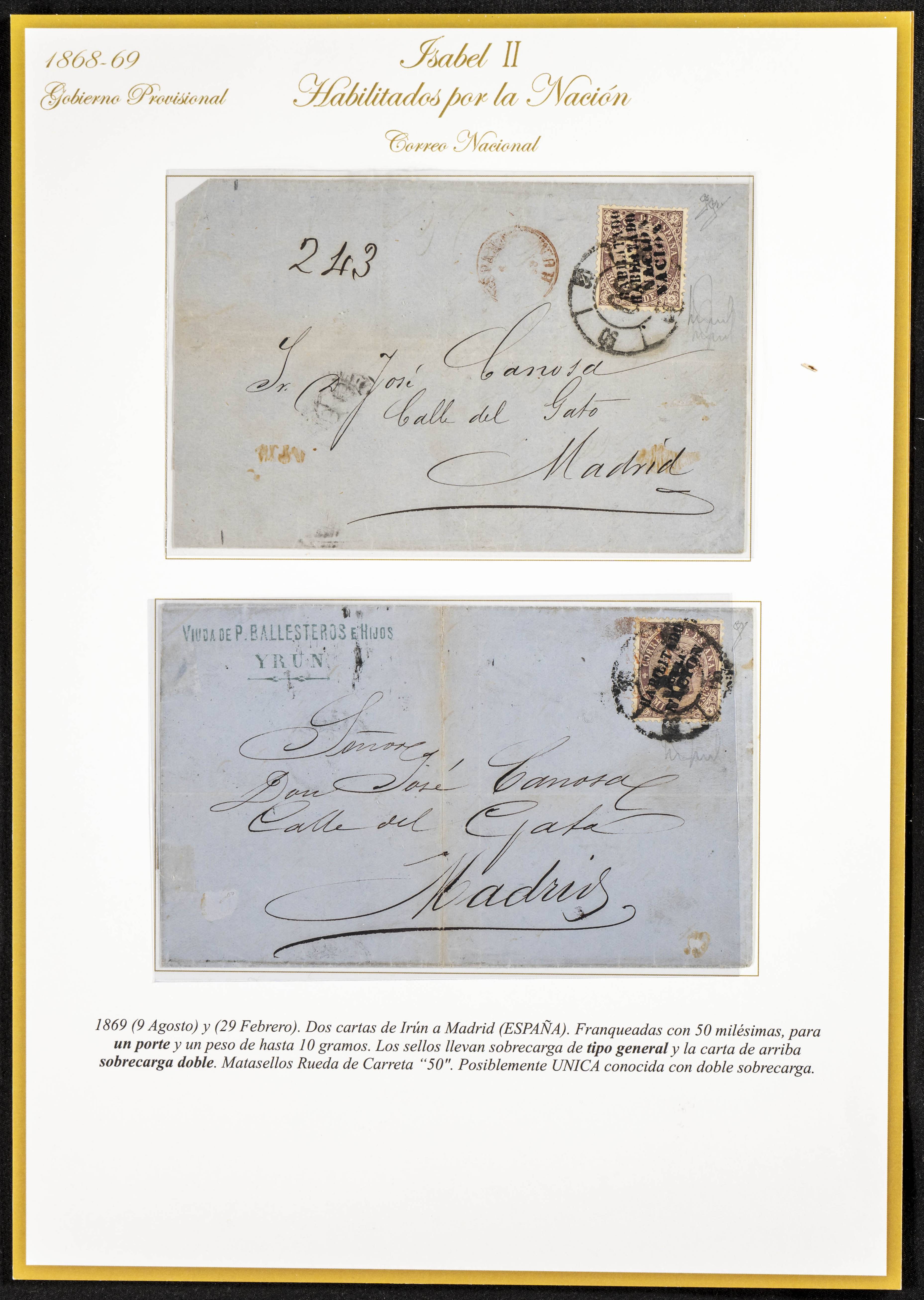 ★/(1869ca). Espectacular colección especializada de las emisiones de Isabel II con sobrecarga HABILITADO POR LA NACION, estando representadas la mayoría de poblaciones o regiones y destacando Madrid (con sellos nuevos y usados y varias cartas, una procedente de Francia), Andalucía (con sellos nuevos y alguna variedad, incluido un falso postal), Teruel (sellos nuevos y usados y tres cartas, una de triple porte), Valladolid (nuevos y usados, algún bloque y tres cartas), así como varias cartas y sellos sueltos con habilitación manuscrita. SE TRATA PROBABLEMENTE DE LA COLECCION MEJOR ENSAMBLADA EN ESTA ESPECIALIDAD. IMPRESCINDIBLE EXAMINAR.