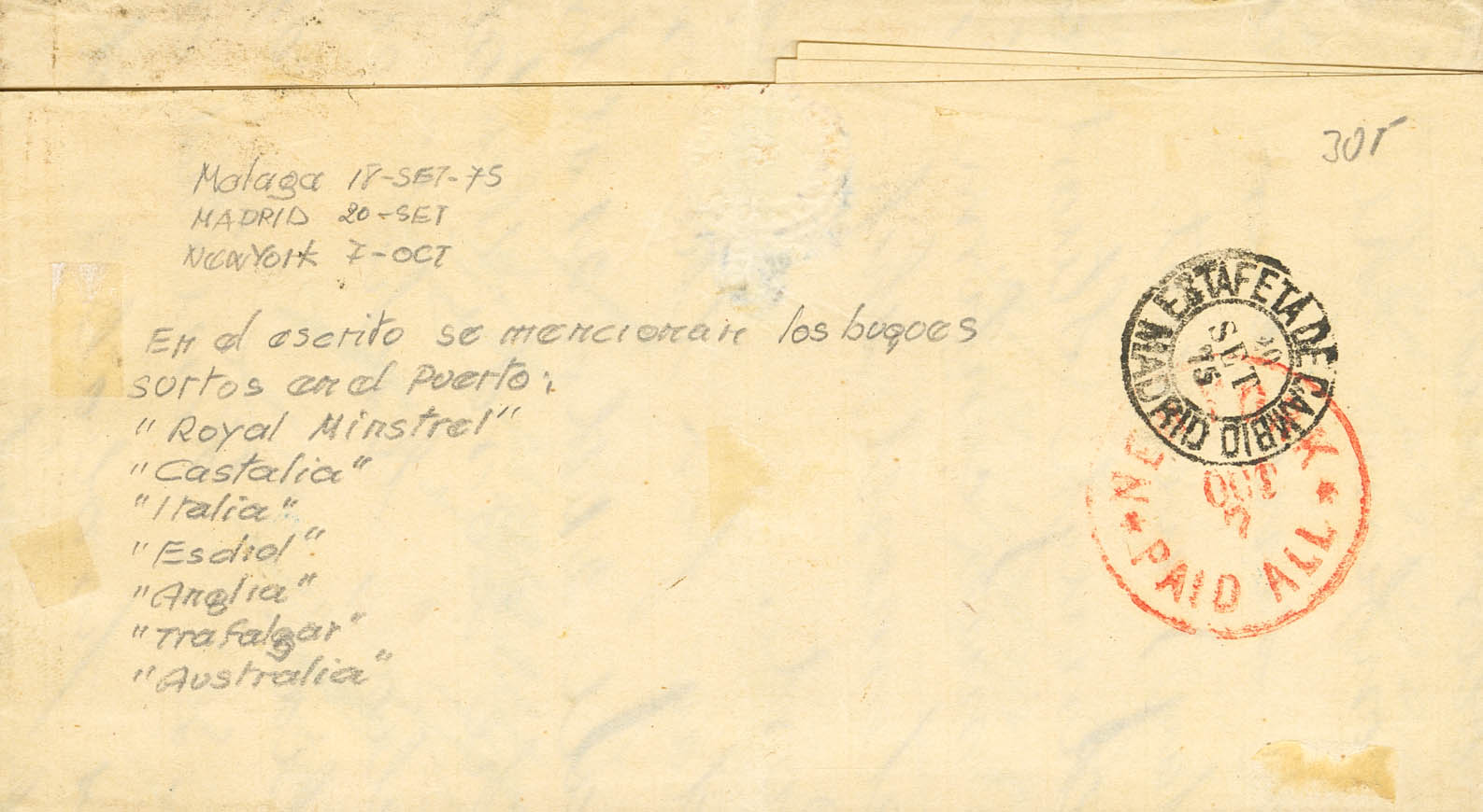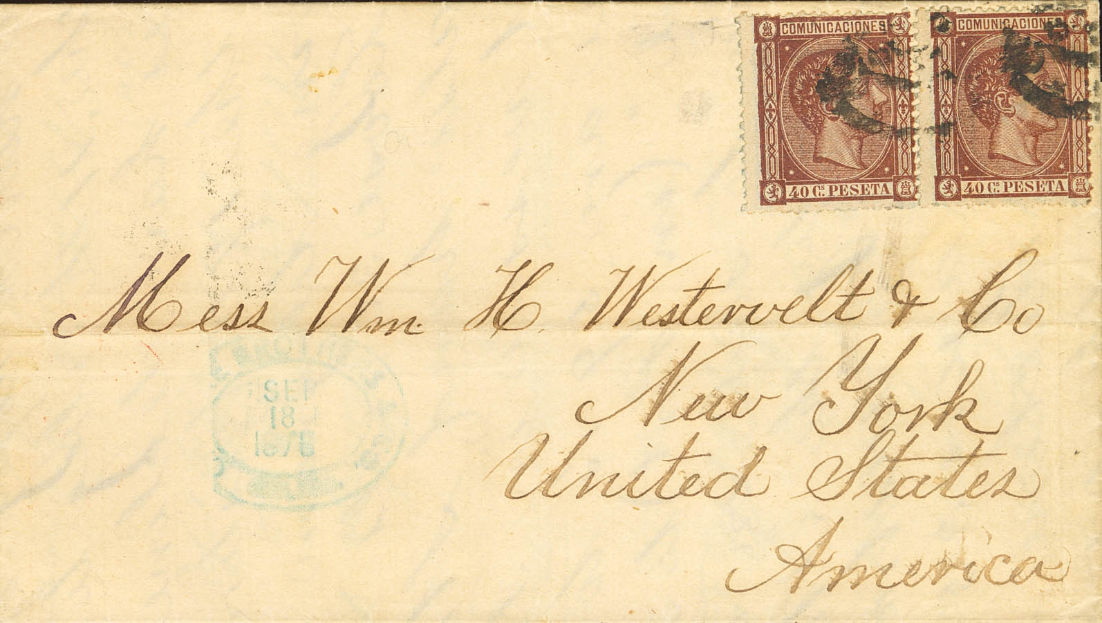 167(3). 1875. 40 cts castaño, pareja. MALAGA a NUEVA YORK (U.S.A.). MAGNIFICA Y RARA, FRANQUEADA CON 80 CTS (ANTIGUA TARIFA DE NOVIEMBRE DE 1871), EN LUGAR DE 25 CTS (NUEVA TARIFA DE 1875).
