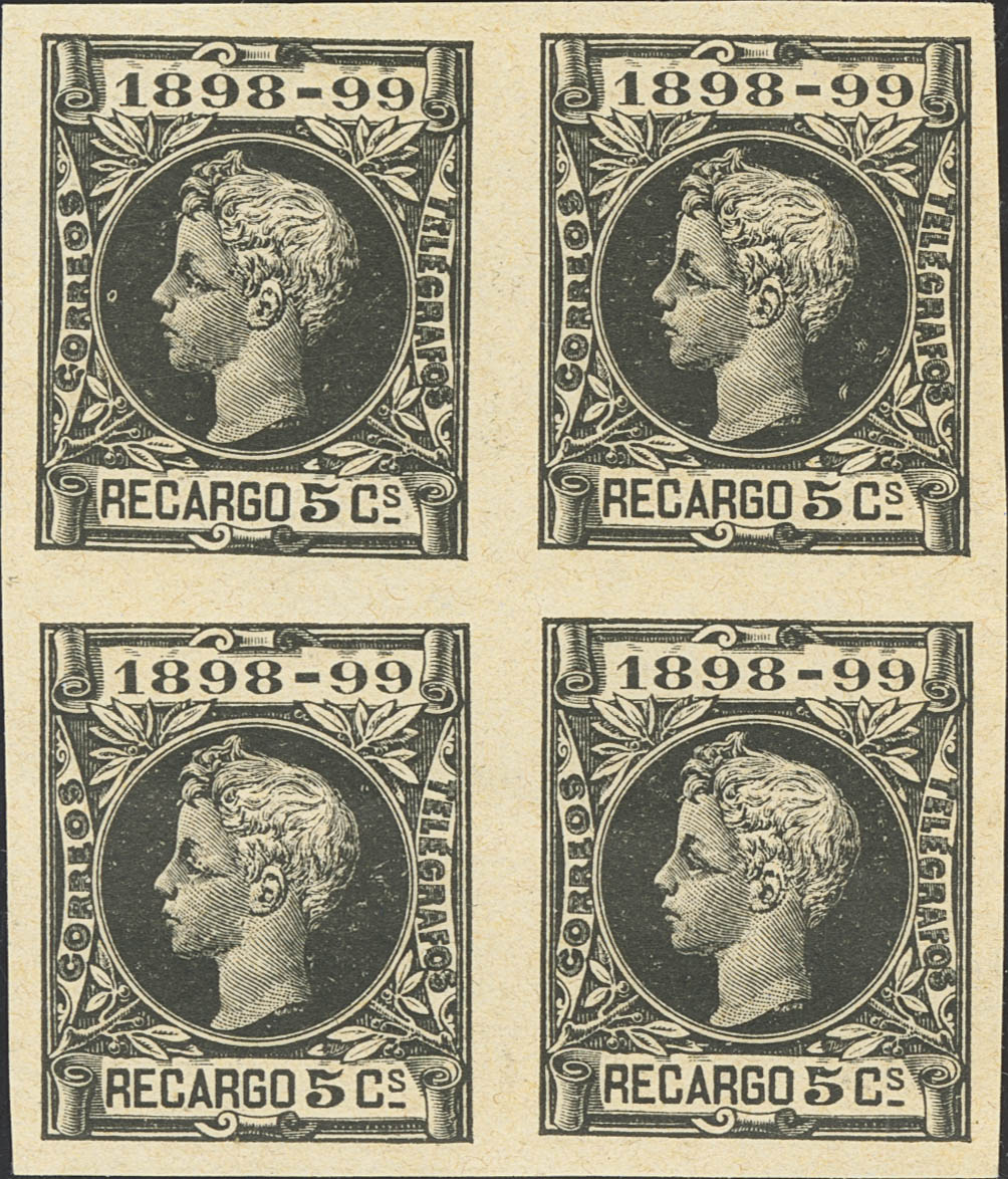 (★) 240s(4). 1898. 5 cts negro, bloque de cuatro. SIN DENTAR. MAGNIFICO Y RARO. Edifil 2026: +284 Euros