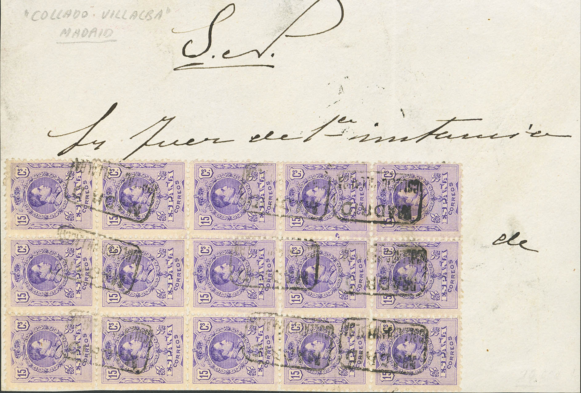 △ 270(15). (1909ca). 15 cts violeta, quince sellos, sobre fragmento de Plica Judicial. Matasello cartería MADRID / COLLADO VILLALBA. MAGNIFICO.