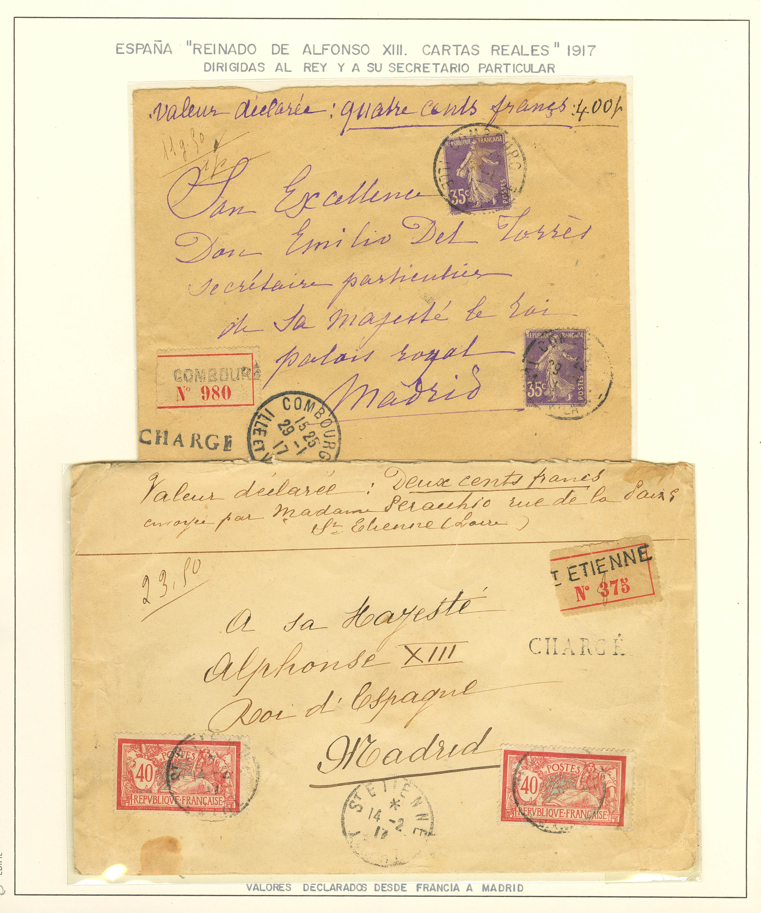 1917. Dos cartas de Valores Declarados circuladas desde COMBOURG y ST. ETIENNE (FRANCIA) ambas dirigidas a MADRID (Una al Sr. Secretario Personal de Alfonso XIII y la otra a Alfonso XIII), con sus correspondientes marcas de salida, llegada, etc. MAGNIFICAS Y RARAS.