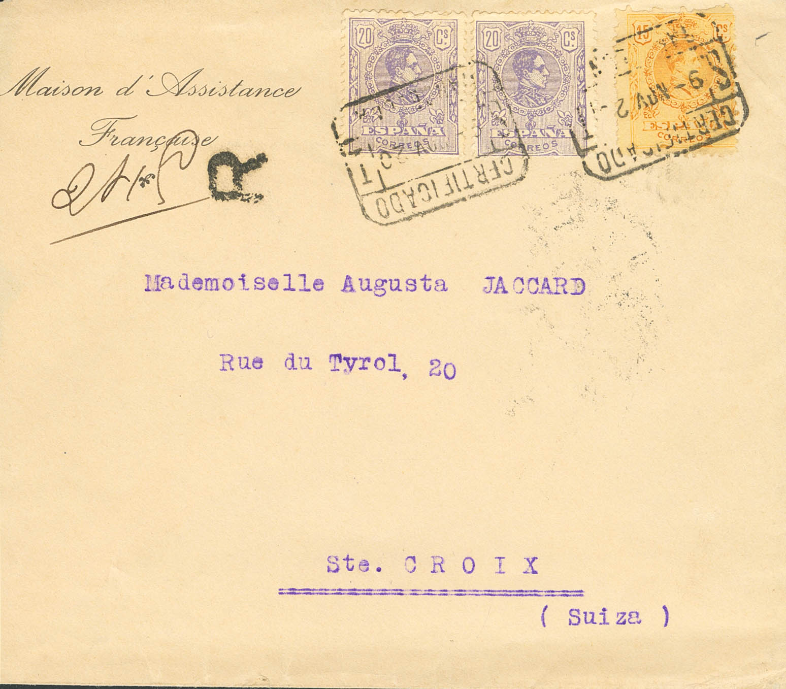 290(2), 271. 1920. 20 cts violeta, dos sellos LITOGRAFIADOS y 15 cts amarillo. Certificado de BARCELONA a STE. CROIX (SUIZA). MAGNIFICA.
