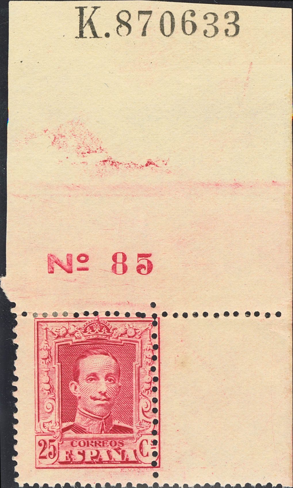 ★★ 317nn. 1922. 25 cts carmín, Tipo II, esquina de pliego. DOBLE NUMERACION. MAGNIFICO Y RARO.