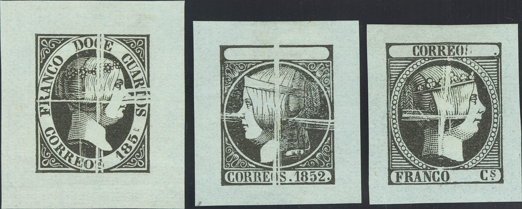 (★) 7P, 12P, 17P. 1851. Conjunto de tres PRUEBAS DE PUNZON (limadas), sobre papel azulado de las emisiones de 1851, 1852 y 1853. MAGNIFICAS. (Gálvez 15, 27, 34)