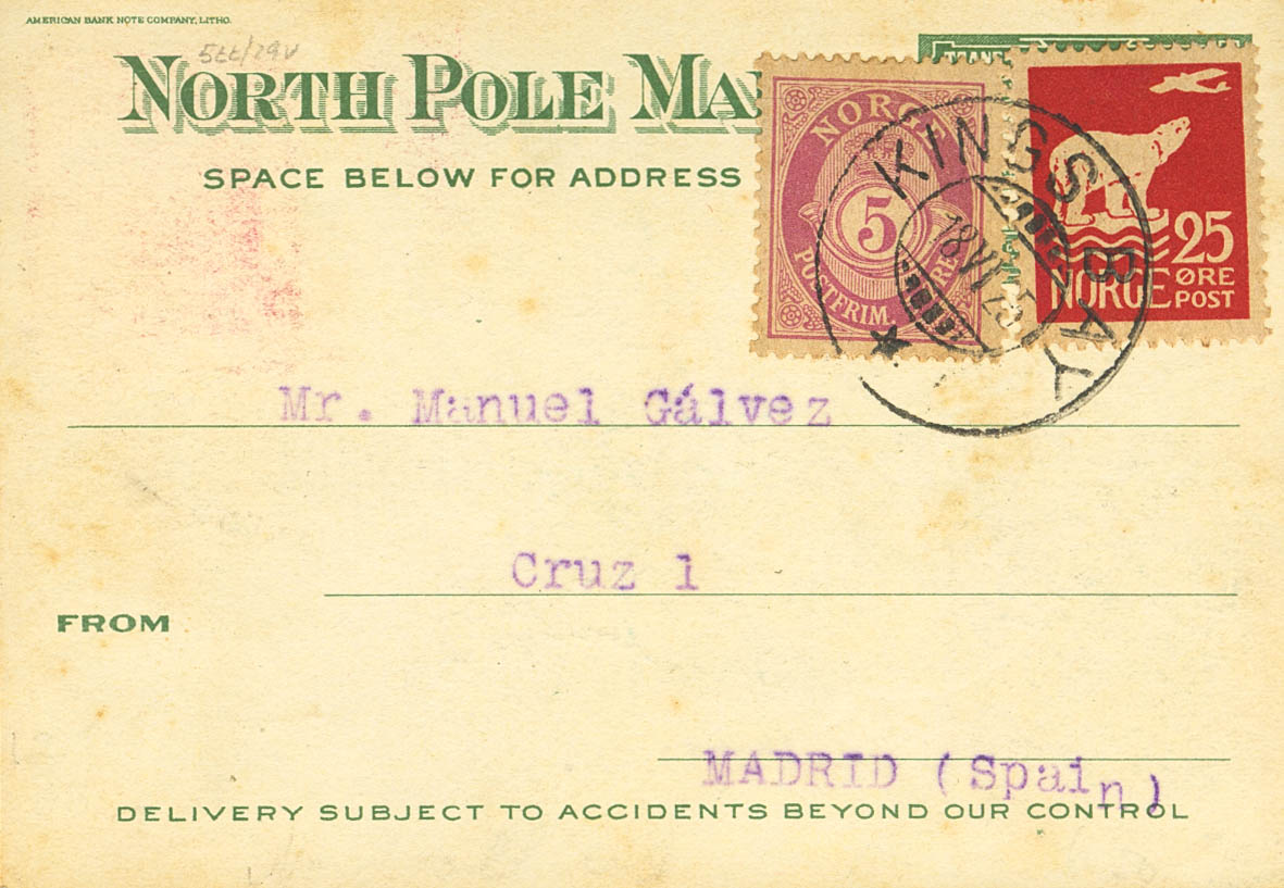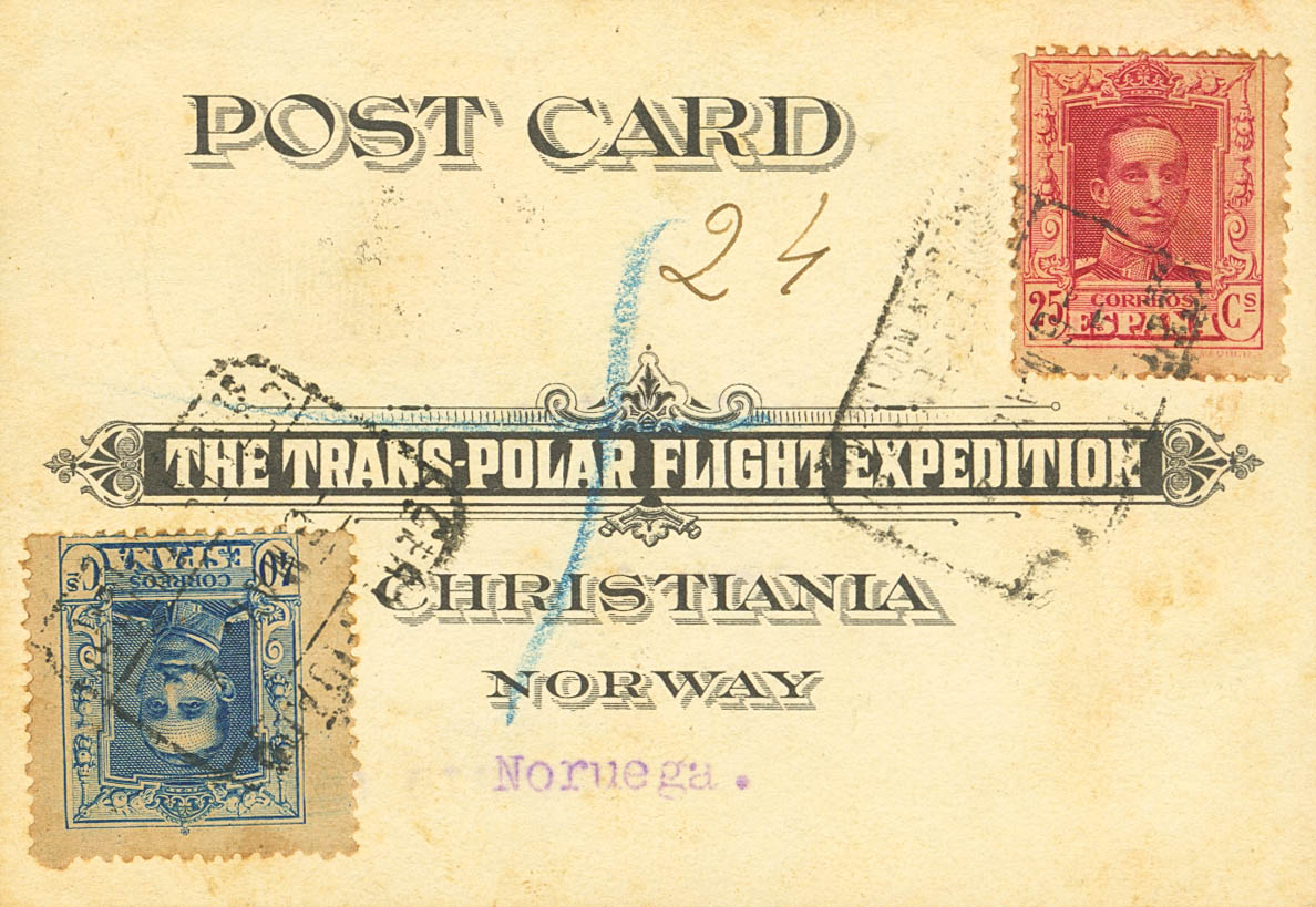 317, 319. 1925. 25 cts y 40 cts. Tarjeta Certificada "THE TRANS-POLAR FLIGHT EXPEDITION" de MADRID a CHRISTIANA y desde ahí en un vuelo de la expedición R.Amundsen llega a KINGSBAY desde donde se reexpide de nuevo a MADRID con el correspondiente franqueo noruego al dorso. MAGNIFICA Y RARISIMA, UNA DE LAS ESCASAS CARTAS AEREAS ESPAÑOLAS CIRCULADAS AL POLO NORTE.