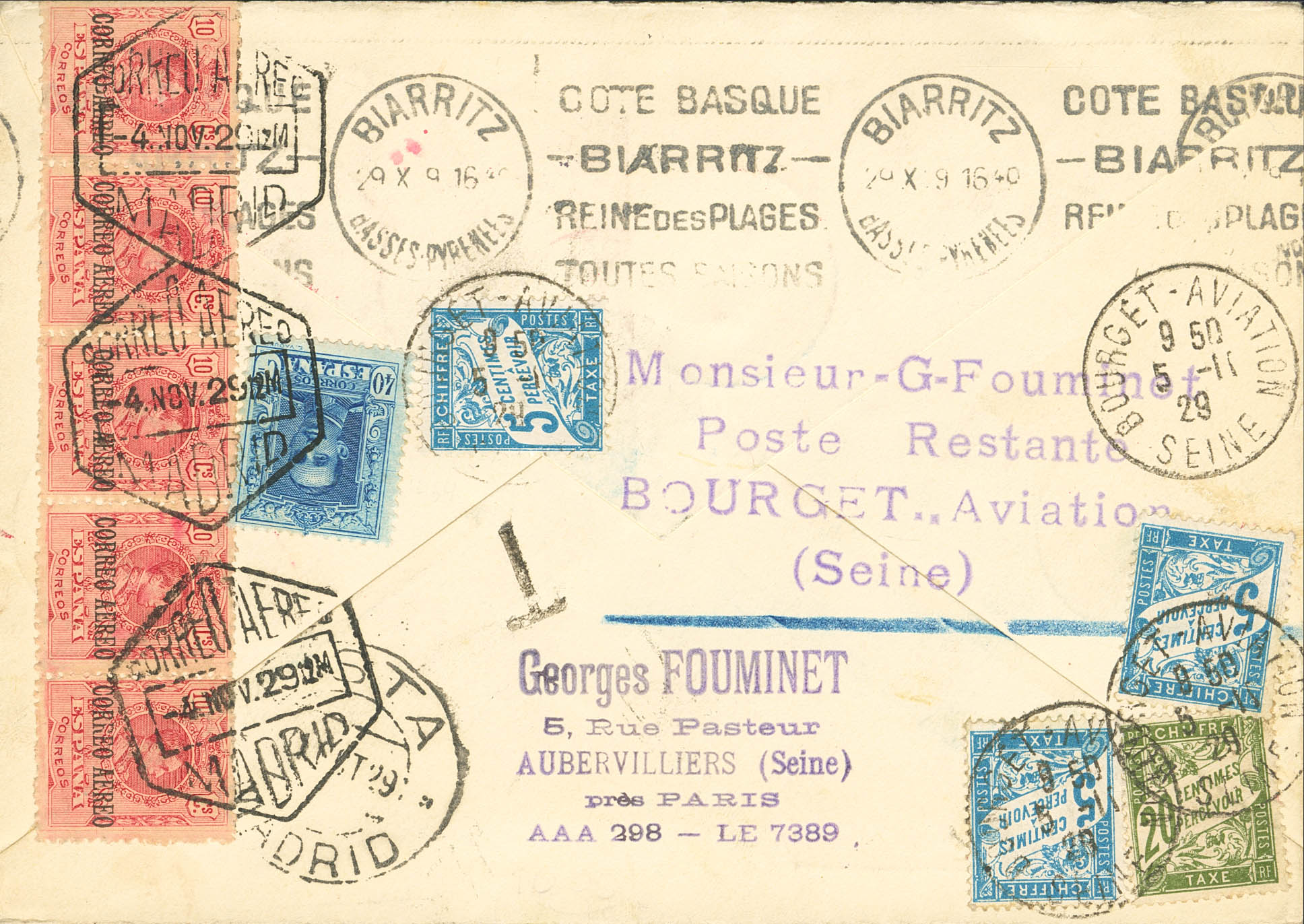 319, 293. 1929. Sellos de Francia de 20 cts lila, 1´10 f carmín rosa, tres sellos y viñeta de Clermont Ferrand. Certificado de LE BOURGET (FRANCIA) a MADRID. Matasello LE BOURGET / PORT AERIEN, en rojo, al dorso se aplican cinco sellos de España de 10 cts y uno de 40 cts, para cubrir el trayecto de vuelta, que resulta insuficiente y es tasada por el correo francés en 35 cts, aplicando tres sellos de tasa de 5 cts y uno de 20 cts. MAGNIFICA Y ESPECTACULAR FRANQUEO DEL VUELO DE APERTURA DE PARIS A MADRID, SOLO S E CONOCEN TREINTA CARTAS.