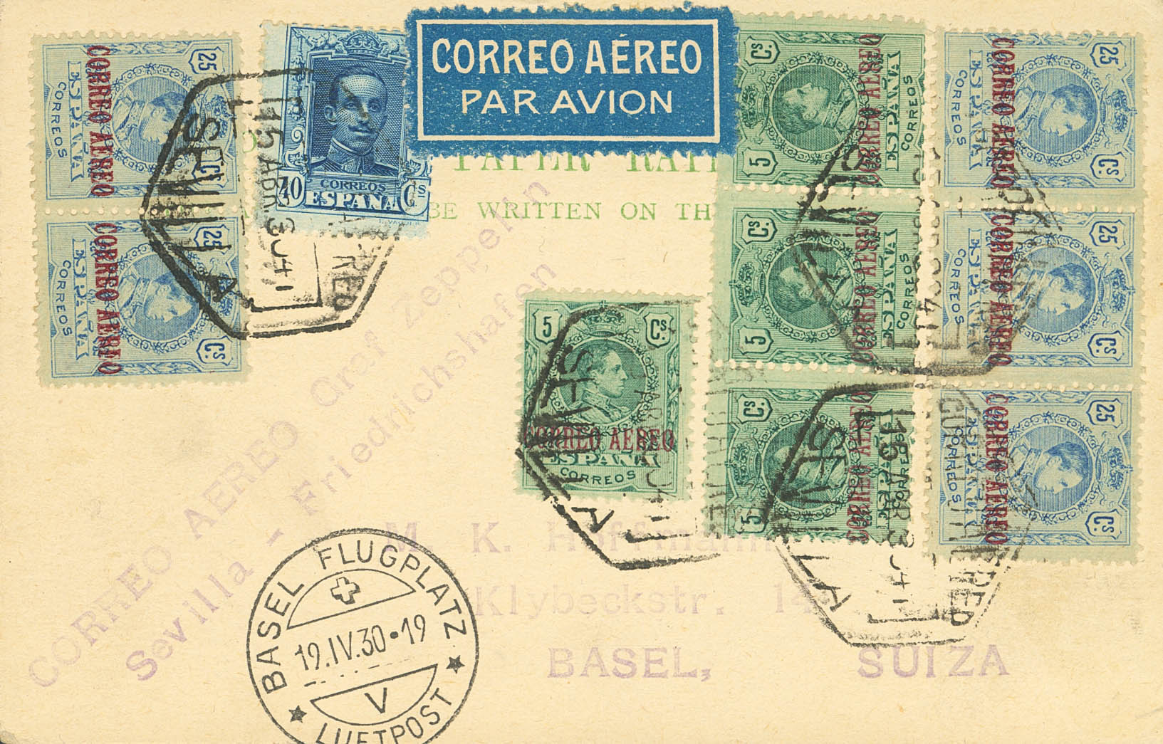 319, 292(4), 294(5). 1930. 40 cts azul, 5 cts verde, cuatro sellos y 25 cts azul, cinco sellos. SEVILLA a BASILEA (SUIZA), inicialmente franqueada para circular por Graf Zeppelin pero finalmente cursada por correo aéreo. En el frente marca CORREO AEREO-GRAF ZEPPELIN / SEVILLA-FRIEDRICHSHAFEN, en violeta y llegada. MAGNIFICA Y RARA.
