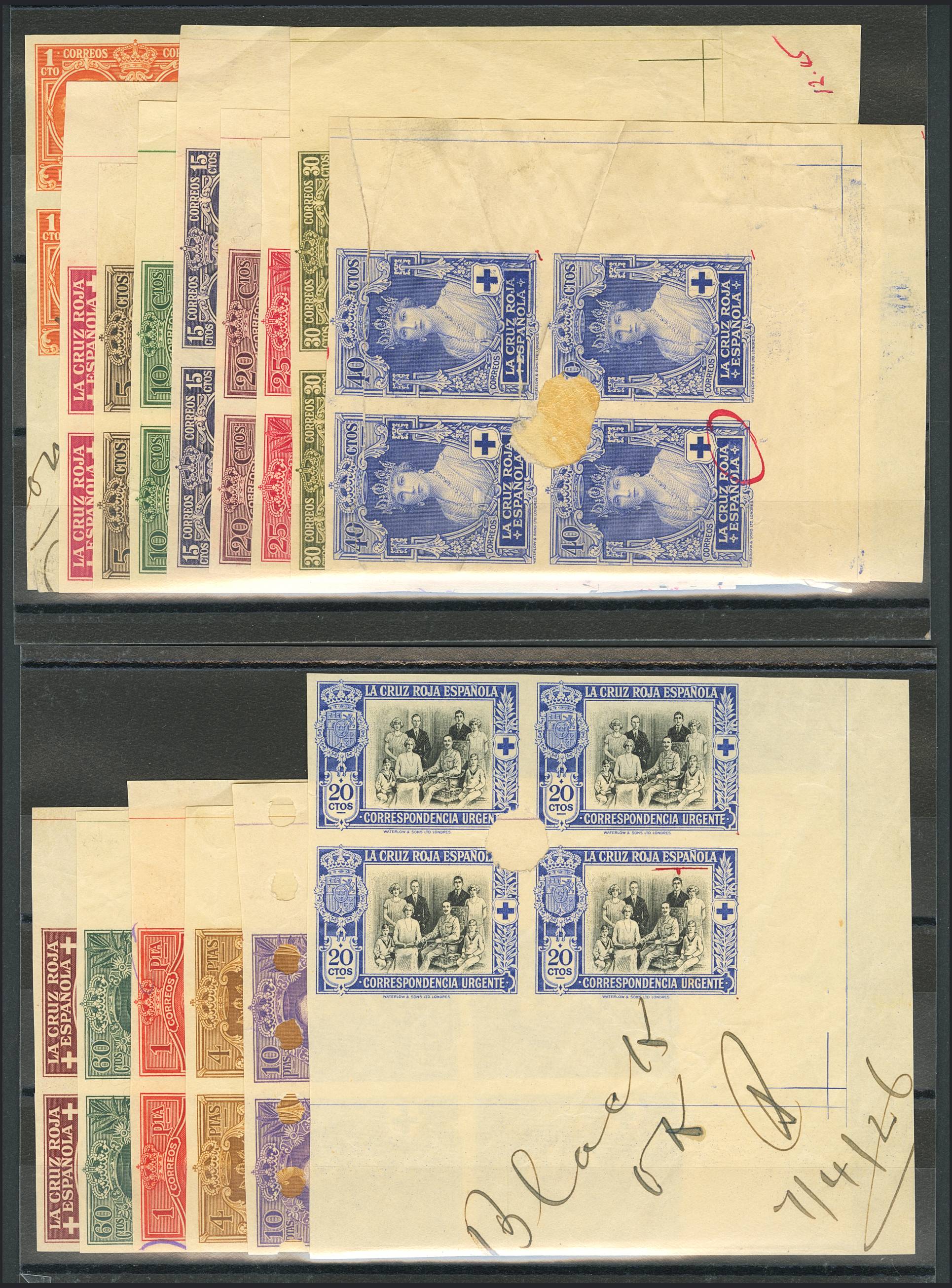 (★) 325/38aMTs(4). 1926. Serie completa, quince valores en bloques de cuatro. CAMBIOS DE COLOR y SIN DENTAR, con taladros angulares y en los colores utilizados en los sellos de Colonias Españolas. MAGNIFICO Y RARISIMO CONJUNTO. Edifil 2020: +4.800 Euros