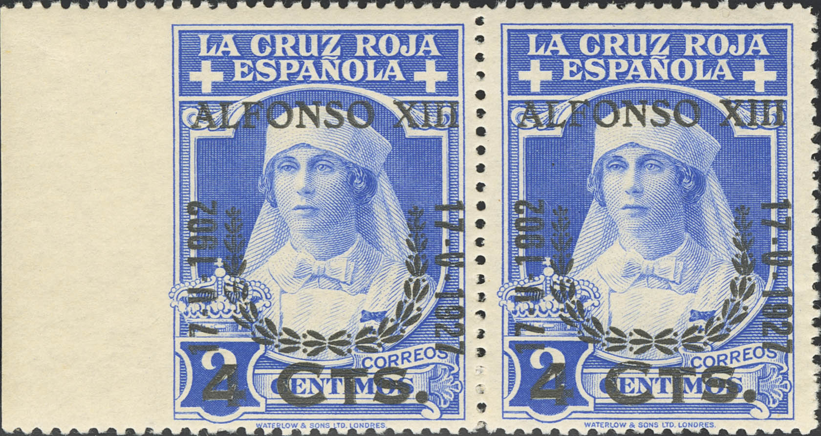★★ 374, 374smi. 1927. 4 cts sobre 2 cts azul, pareja. Un sello SIN DENTAR EL MARGEN IZQUIERDO. MAGNIFICA Y MUY RARA. Edifil 2020: ++350 Euros