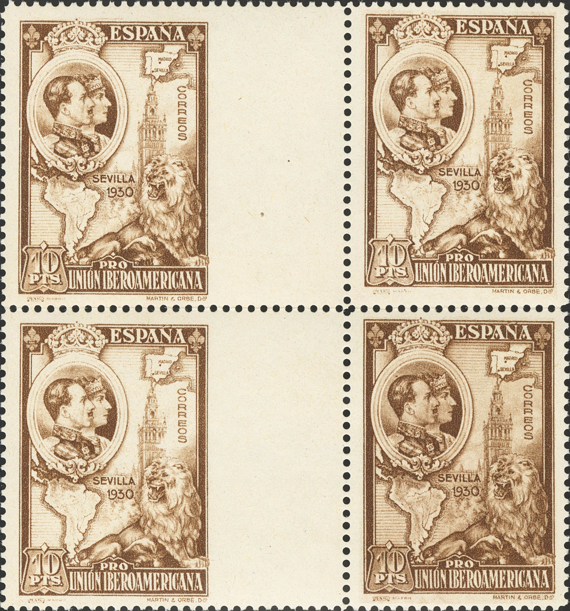 ★★ 580(4). 1930. 10 pts castaño, bloque de cuatro con INTERPANEL. Dos sellos SIN DENTAR EL MARGEN DERECHO. MAGNIFICO Y MUY RARO.