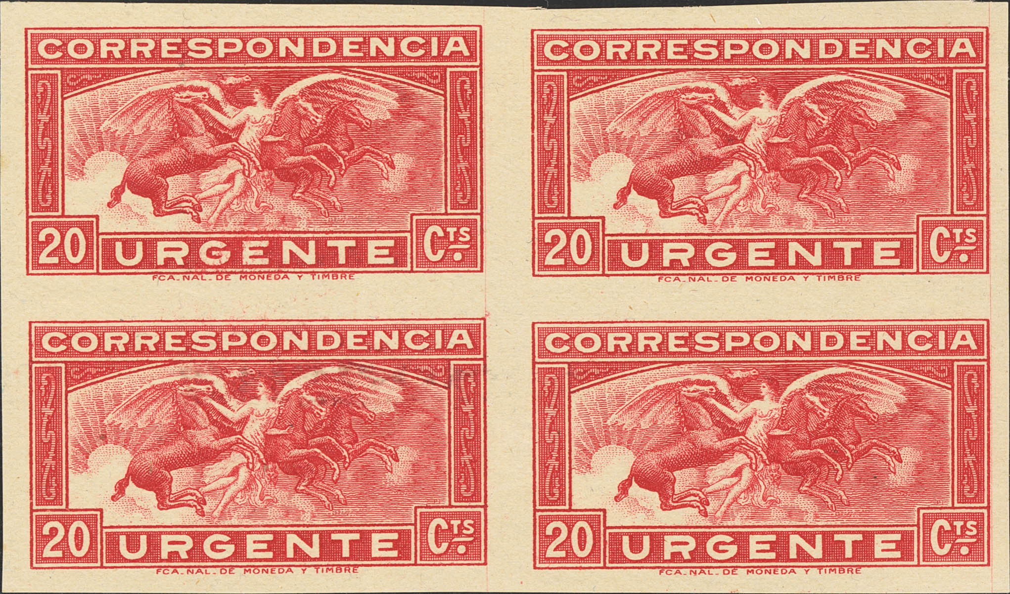 ★★/★ 679s(4). 1933. 20 cts carmín, bloque de cuatro (dos sellos sin fijasellos). SIN DENTAR. MAGNIFICO. Edifil 2020: +212 Euros