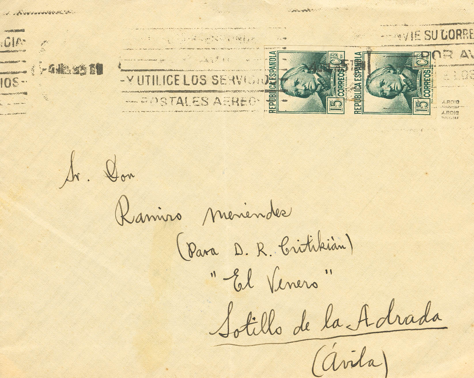 683s(2). 1935. 15 cts verde gris, pareja SIN DENTAR. MADRID a SOTILLO DE LA ADRADA. Al dorso llegada. MAGNIFICA Y MUY RARA.