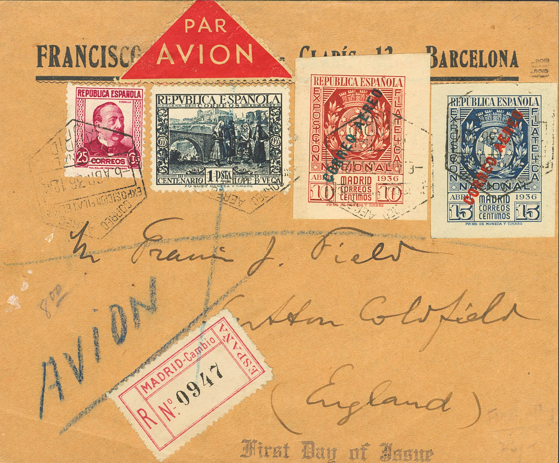 729/30, 685, 693. 1936. Serie completa, 25 cts carmín y 1 pts pizarra. Certificado de MADRID a SUTTON COLFIELD (GRAN BRETAÑA). Matasello de la exposición y al dorso llegada. MAGNIFICA Y RARISIMA VERDADERAMENTE CIRCULADA AL EXTRANJERO.