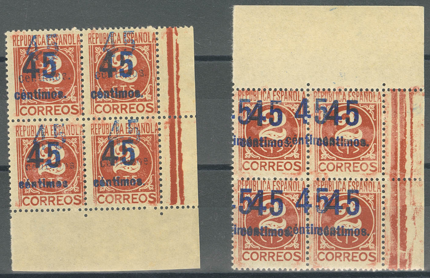 ★★/★ 744hh(8). 1938. 45 cts sobre 2 cts castaño, dos bloques de cuatro. DOBLE SOBRECARGA, una en horizontal y la otra en vertical. MAGNIFICOS. Edifil 2020: +112 Euros