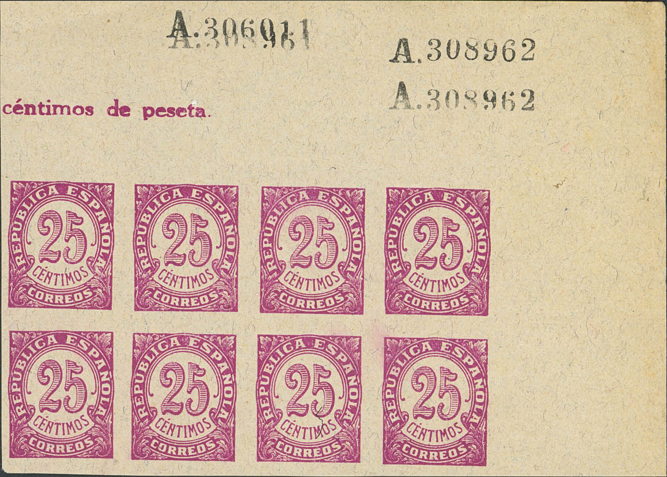 (★) 749s(8). 1938. 25 cts violeta, bloque de ocho. SIN DENTAR y CUADRUPLE NUMERACION, en la esquina del pliego. MAGNIFICO.