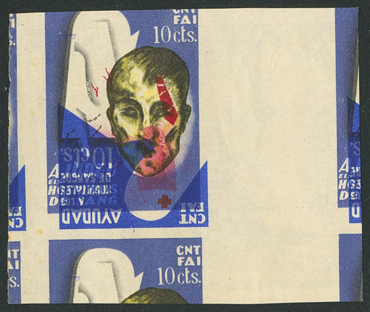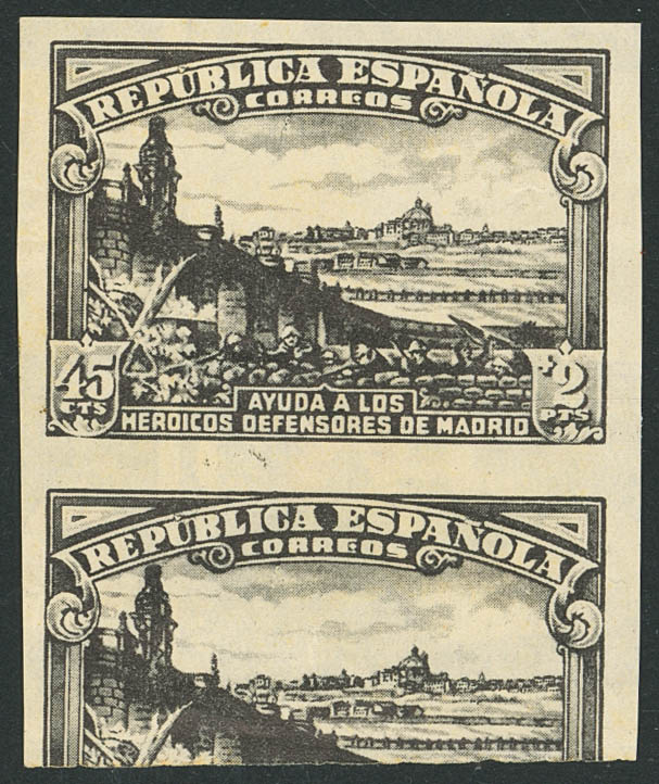 (★) 757P. 1938. 45 cts + 2 pts negro. ENSAYO DE PLANCHA SIN DENTAR (al dorso impresión del 10 cts de C.N.T. / F.A.I., de Hospitales de Sangre). MAGNIFICO.