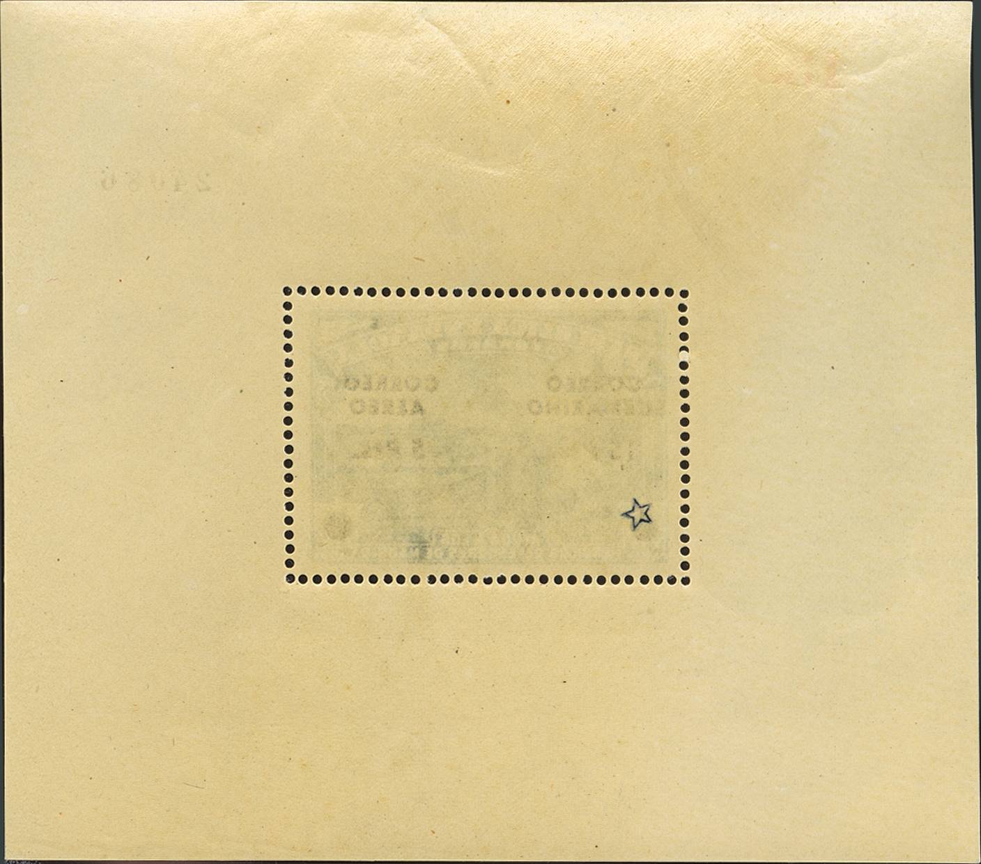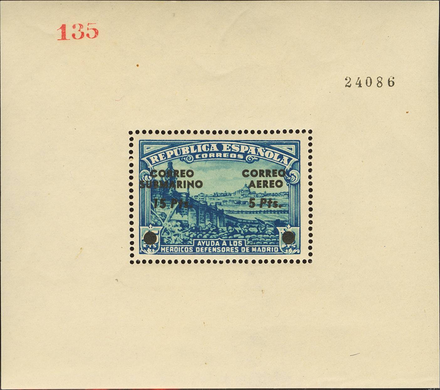 ★★ 758FN. 1938. Hoja bloque. Sobrecarga de iniciativa privada CORREO / SUBMARINO / 15 PTS / CORREO / AEREO / 5 PTS. MAGNIFICA Y RARA. Edifil 2020: 155 Euros