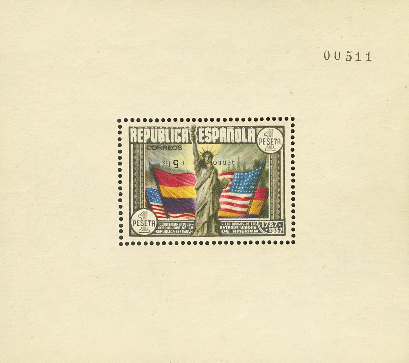 ★ 766. 1938. AEREO+5 PTS, hoja bloque. SOBRECARGA INVERTIDA (Nº00511, numeración privada). MAGNIFICA. Cert. EXFIMA.